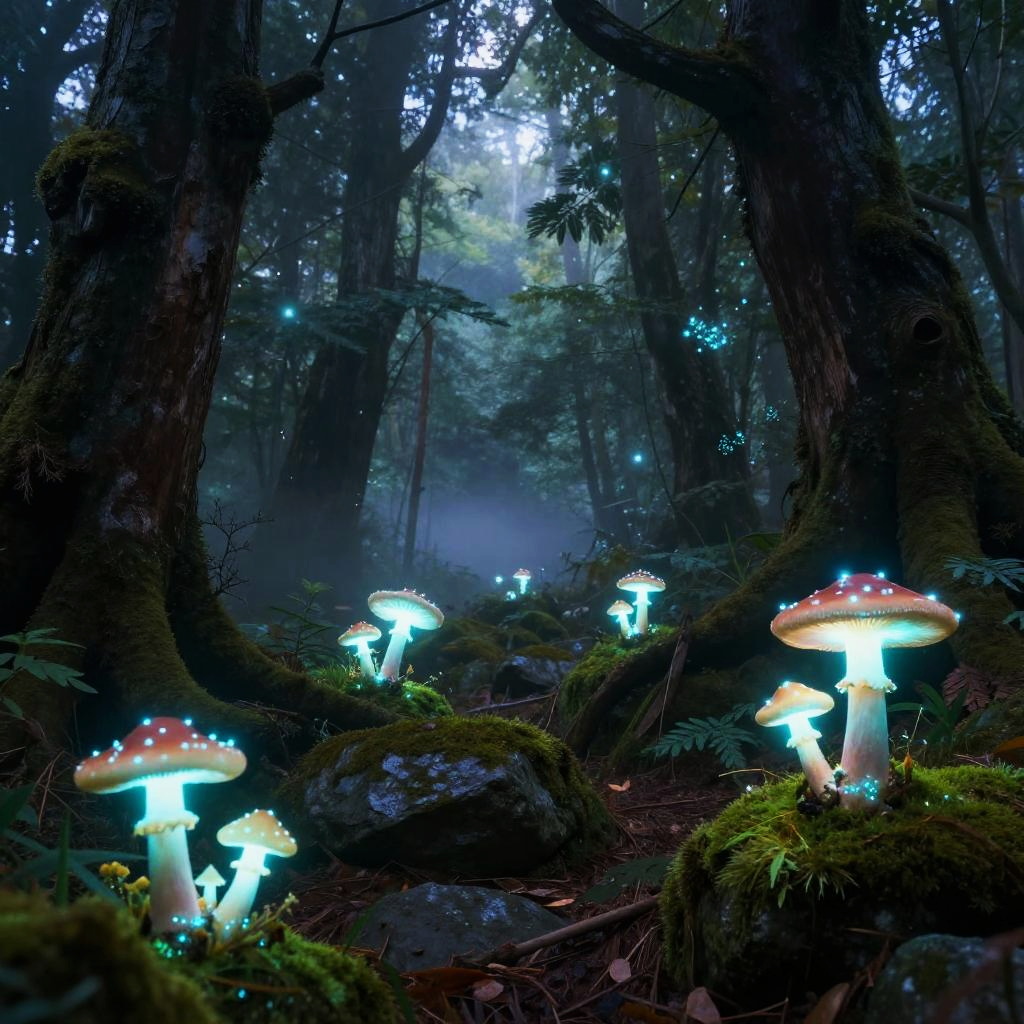 Glowing Neon Mushroom Forest Scene