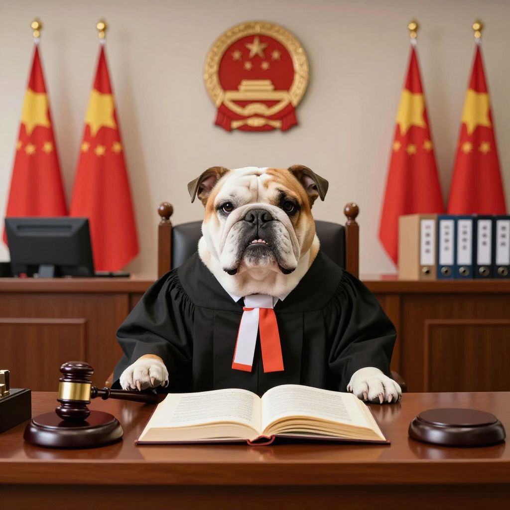 A bulldog dressed in a traditional judge's robe, presiding over a legal case in a Taiwanese courtroom. The dog sits behind a desk with an open law book, holding a gavel. The background features the emblem of Taiwan, red flags, and legal files with traditional Chinese text, creating a formal and distinctive Taiwanese judicial atmosphere.