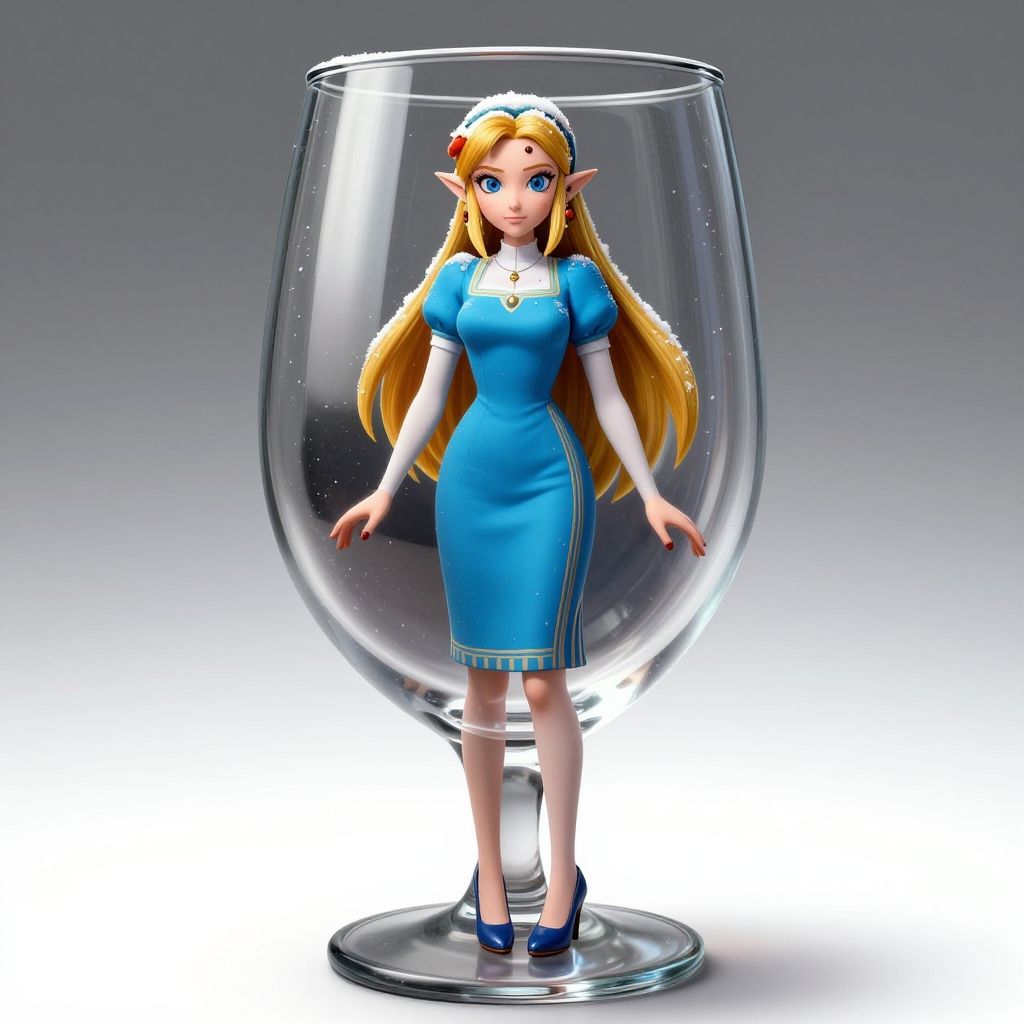 Digital CGI of a blonde, blue-eyed elf girl in a blue maid dress and heels, standing inside a giant clear glass bowl.