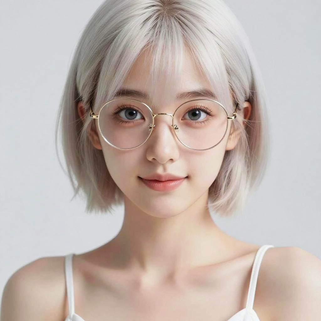 This is a digital, hyper-realistic portrait of a young woman with fair skin and short, straight, white-blonde hair that frames her face. She has large, expressive blue eyes and wears round, gold-rimmed glasses that accentuate her delicate features. Her lips are slightly curved into a subtle smile. She is dressed in a white spaghetti strap top, revealing her slender neck and shoulders. The background is a plain, bright white, making her the focal point of the image. The lighting is soft, highlighting her smooth skin and the gentle texture of her hair. The overall style is contemporary and polished.