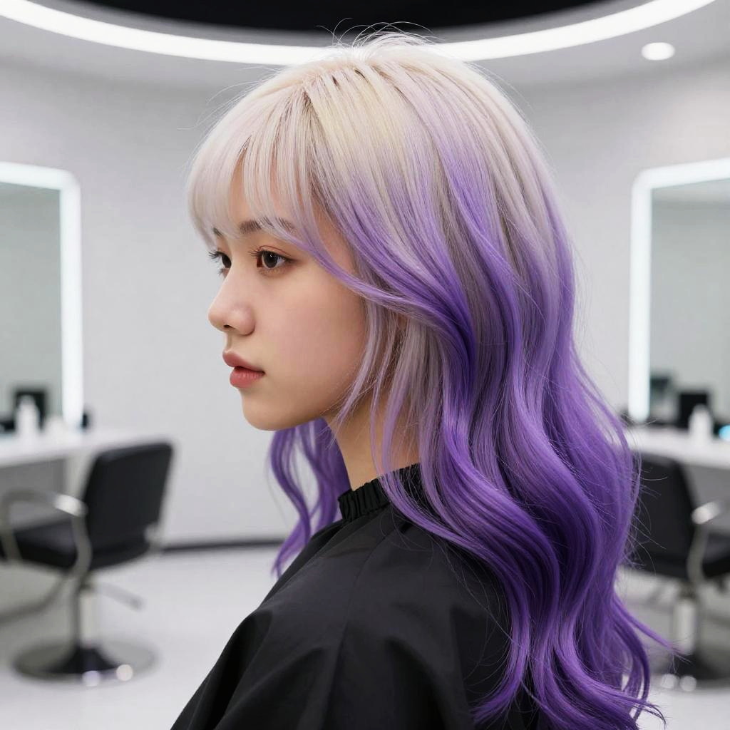 Photograph of a young woman with light skin and platinum blonde hair that transitions into vibrant purple at the ends. She has straight, shoulder-length hair with bangs, and she is wearing a black salon cape. Her expression is neutral, with light makeup emphasizing her eyes and lips. The background is a modern, well-lit salon with white walls, black leather salon chairs, and illuminated mirrors. The image is sharply focused on her face and hair, with a slight blur in the background, highlighting the salon's sleek and contemporary design.