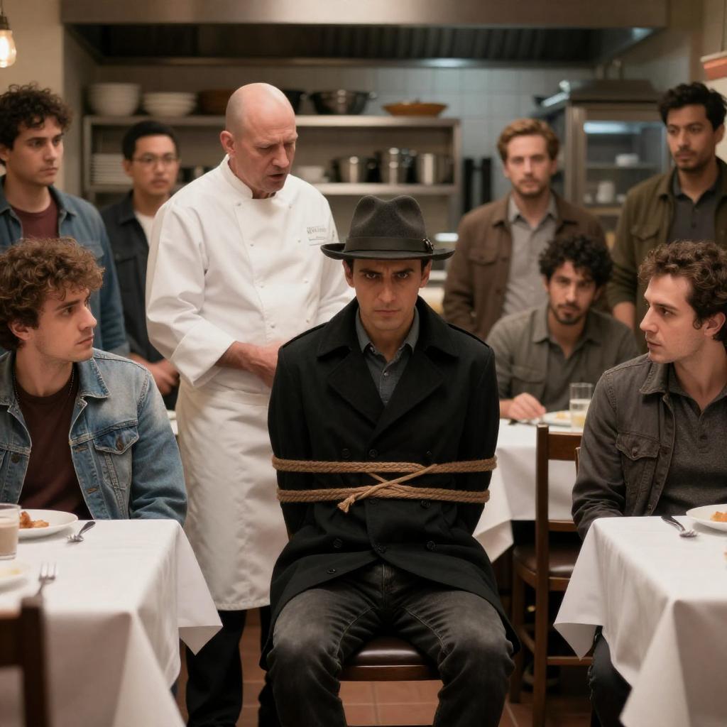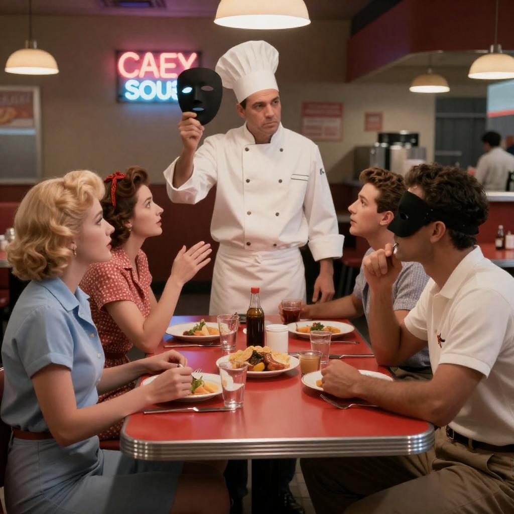 Diner scene with six people. Chef in white hat and coat raises black mask. Blonde woman gestures. Masked man at right. Red countertop with dishes, condiments. Neon signs in background. People in casual, 1950s-style clothing. Intense, chaotic atmosphere.
