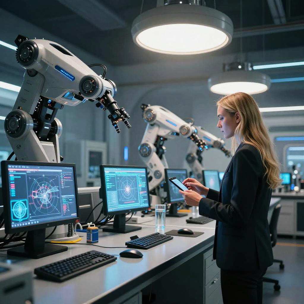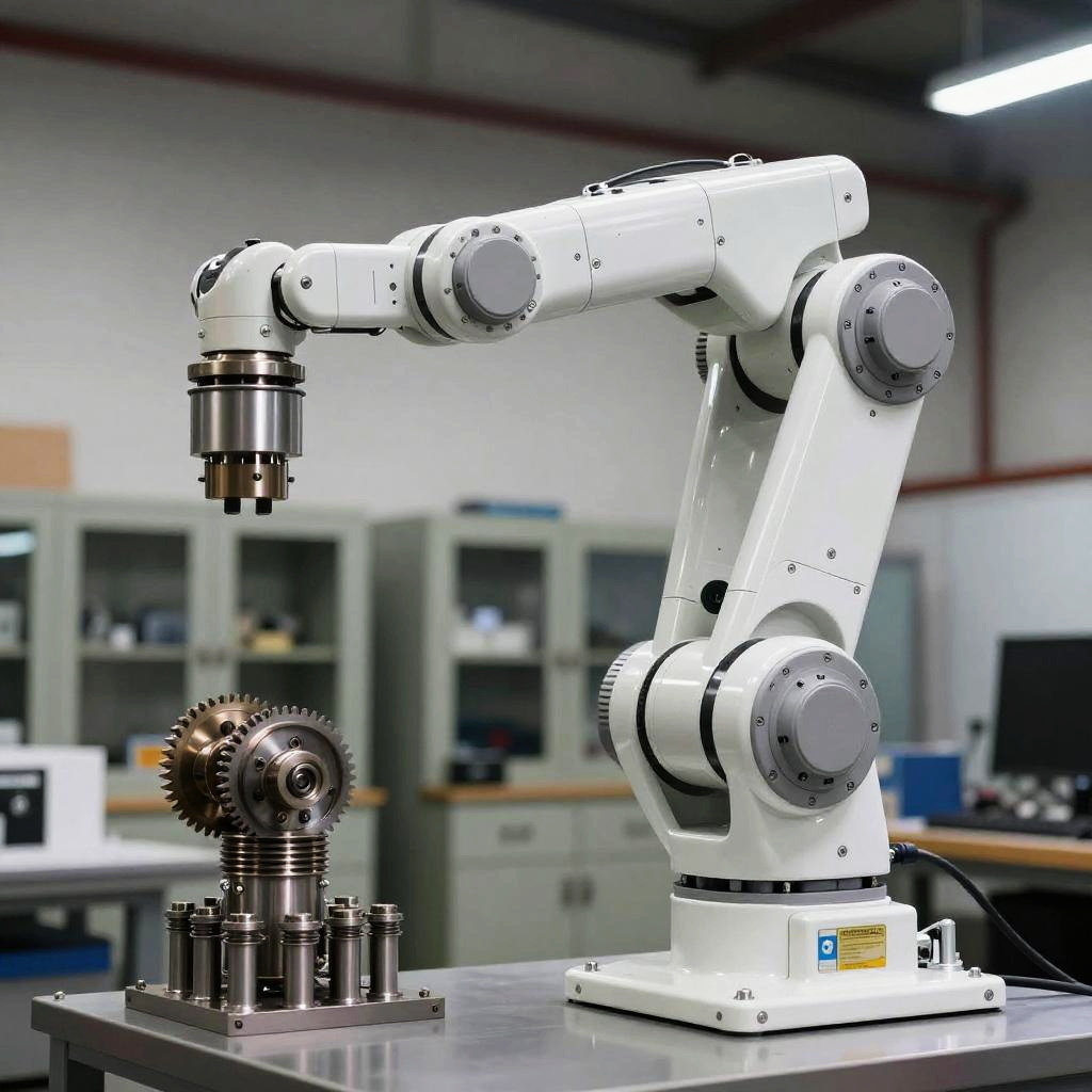 Robot polyarticulé complex limb structure, multi-jointed articulation for extreme mobility, high-tech workshop environment, detailed gears and pistons visible