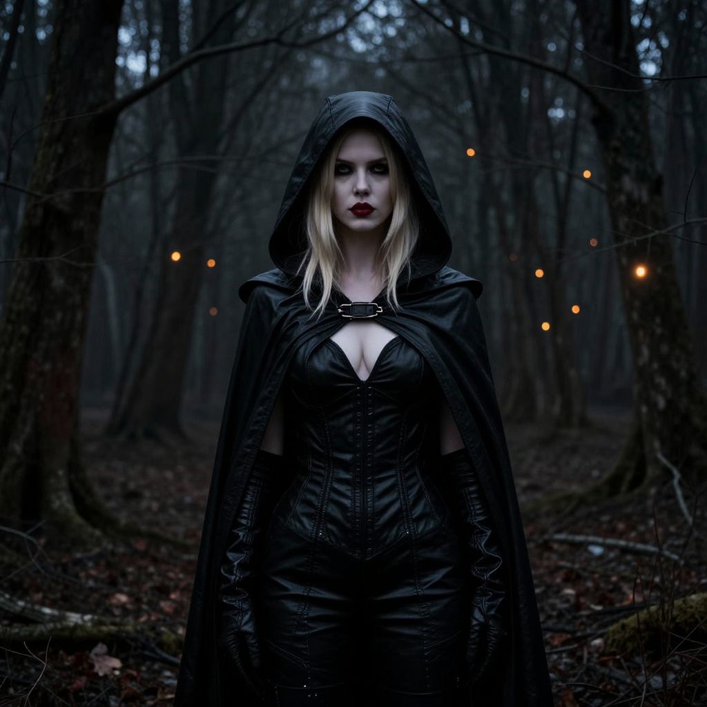 Digital art of a pale-skinned woman with blonde hair, wearing a black leather hooded cloak and gloves, standing in a dark, eerie forest. Her cloak is draped over her shoulders, exposing a deep cleavage. Her red lips stand out against the dark background. The forest has tall, leafless trees with glowing, orange-yellow lights scattered among them. The overall mood is mysterious and haunting.