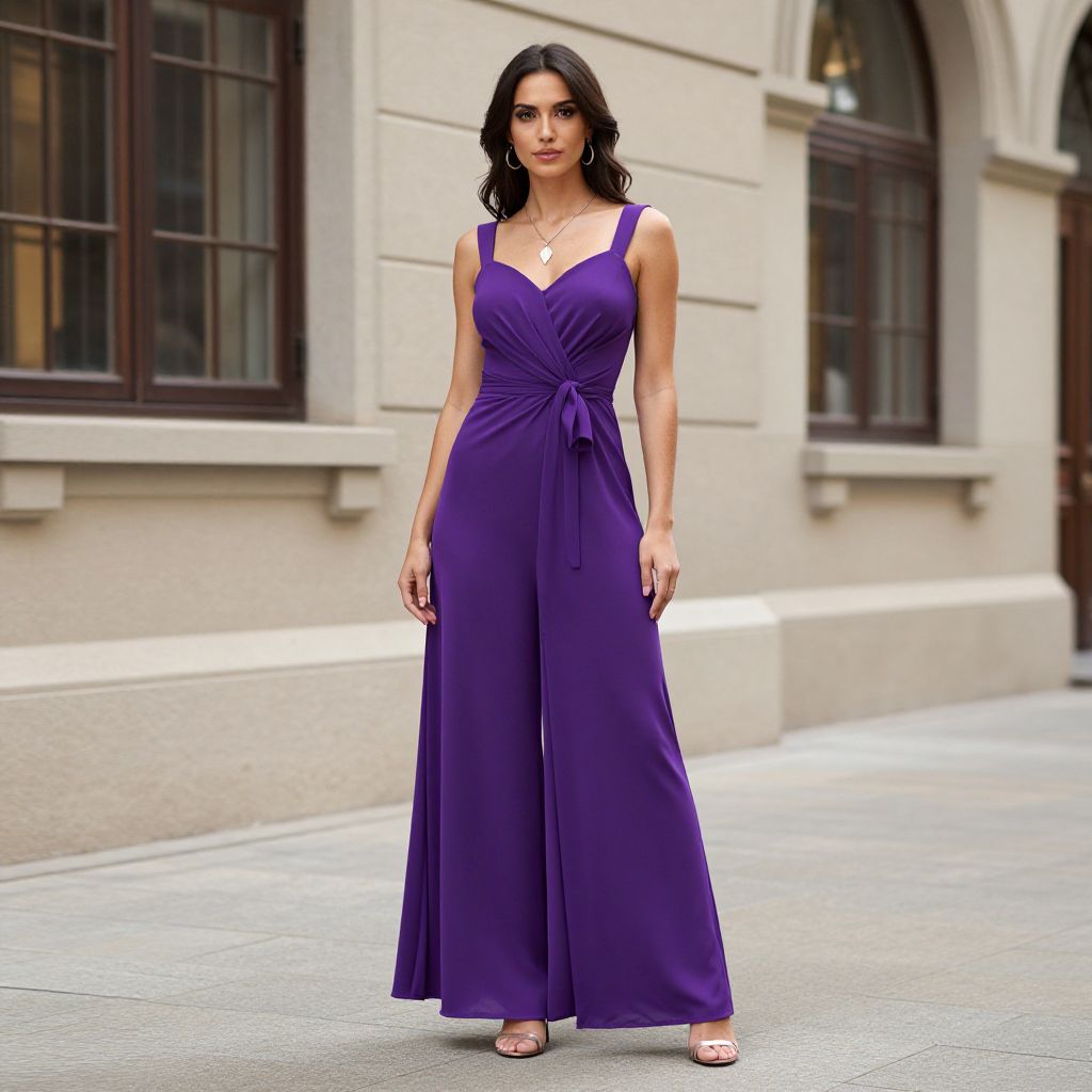 Photograph of a tall, slender woman with medium brown skin and long, wavy black hair. She wears a sleeveless, deep purple, floor-length maxi dress with a tied waist and V-neckline, paired with nude open-toe heels. Her dress has a smooth, silky texture. She stands confidently on a paved street in front of a beige building with large, dark brown windows. The background includes arched architectural details. She accessorizes with a simple gold necklace and has minimal makeup, emphasizing her natural beauty. The scene is well-lit with soft daylight.