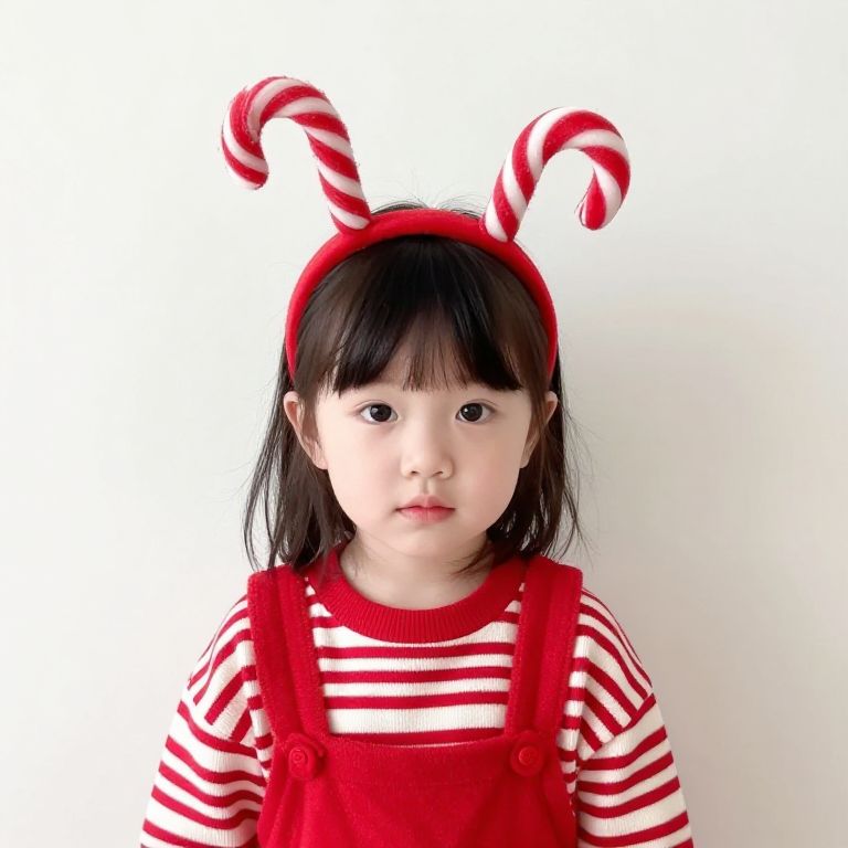 A young girl is wearing a red and white striped outfit with a candy cane on her head.