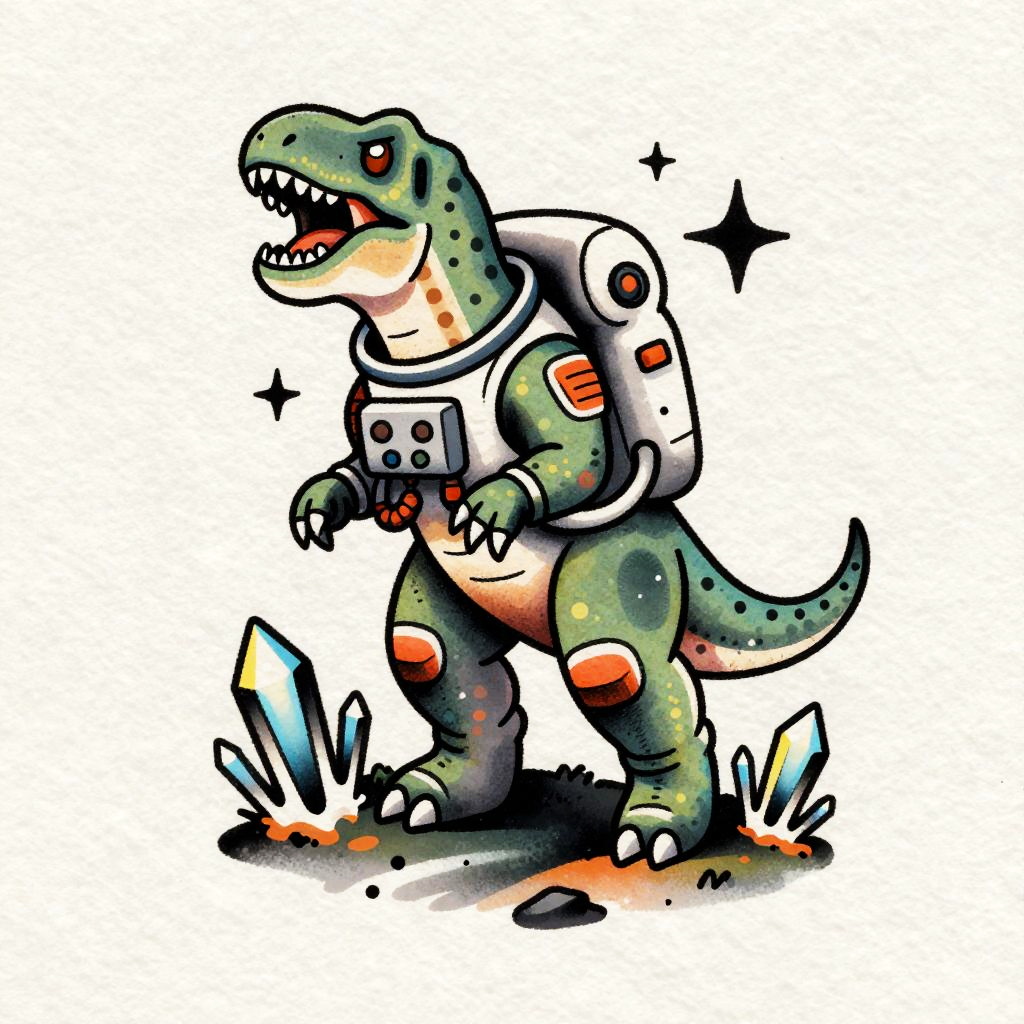 Dinosaur astronaut tattoo design, vivid colors and bold lines, T-rex wearing a detailed space helmet floating in cosmic background with stars and planets, futuristic sci-fi style with intricate shading and dynamic composition