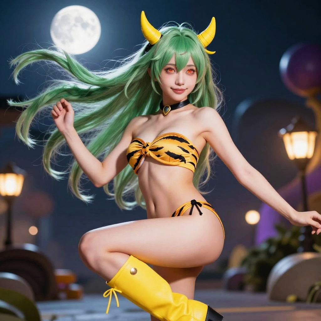 (best quality, masterpiece, colorful, dynamic angle, realistic)\Lum\, upper body photo, fashion photography of cute, intense long green hair, orange eyes, tiger print, strapless bikini, yellow boots, yellow little horns, small horns, \Lum\, in dynamic pose, bokeh, (intricate details, hyperdetailed:1.15), moonlight passing through hair, perfect night, (colorful fantasy art background), (official art, extreme detailed, highest detailed), HDR+