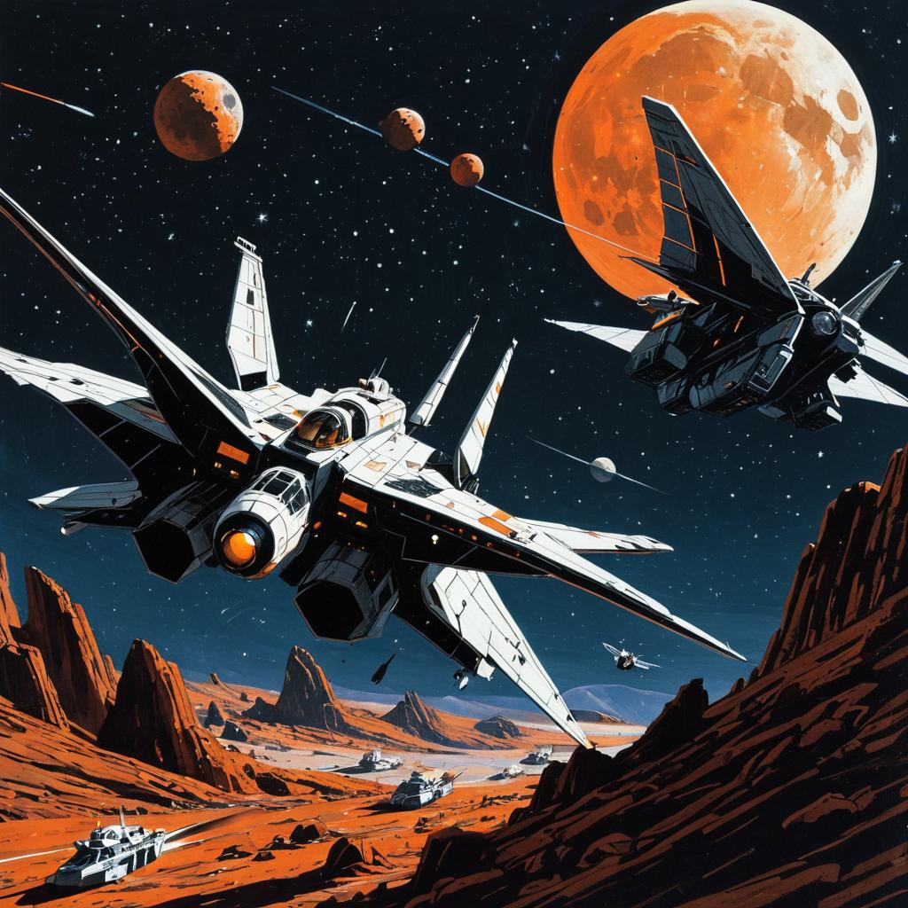 Illustration in the style of Syd Mead, a space battle between butterfly-inspired frigates with a rust-colored rocky moon in the background, as seen from space