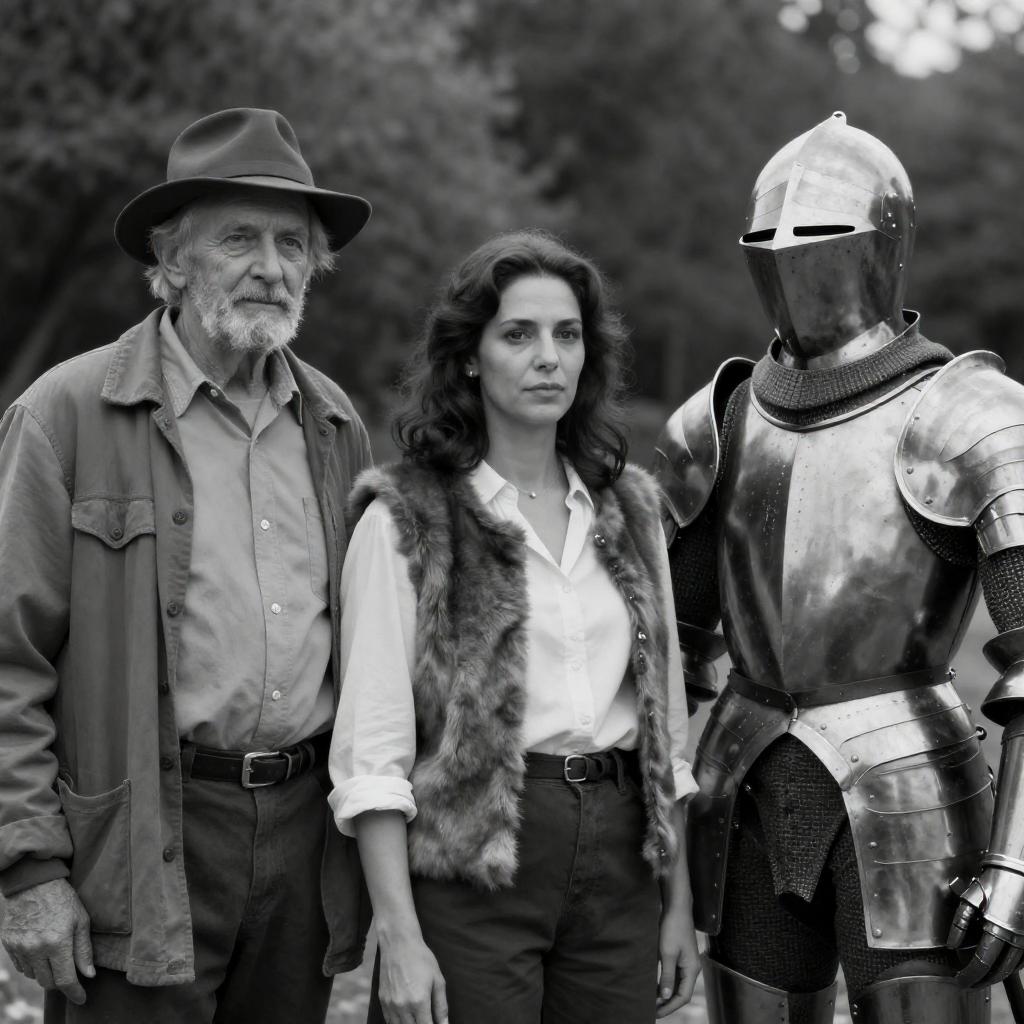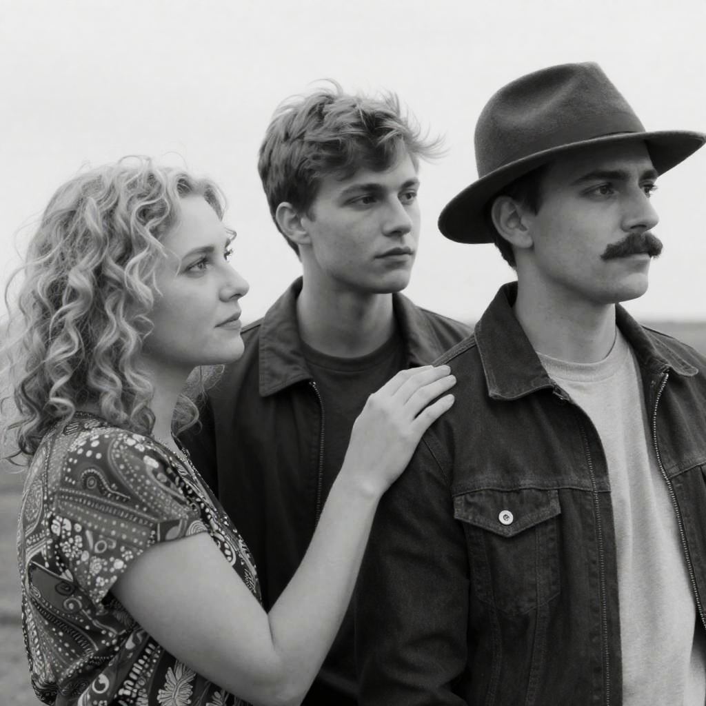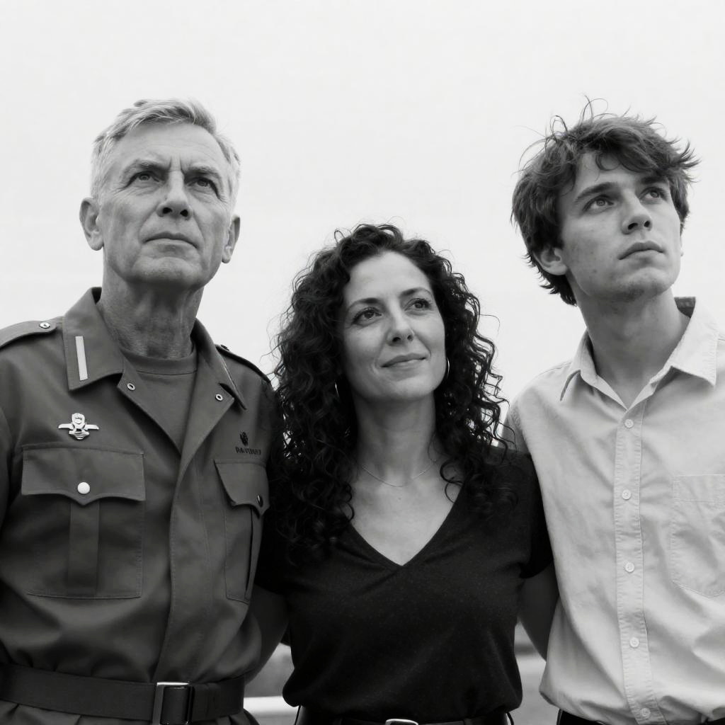 Black and white photograph of three people standing close together. On the left is an older man with short grey hair wearing a military-style jacket, looking slightly upward. In the center is a woman with curly dark hair, a serious expression and a subtle smile, wearing a dark V-neck shirt. On the right is a younger man with messy hair, wearing a light button-up shirt, also looking upward. The background is plain and the mood is contemplative.