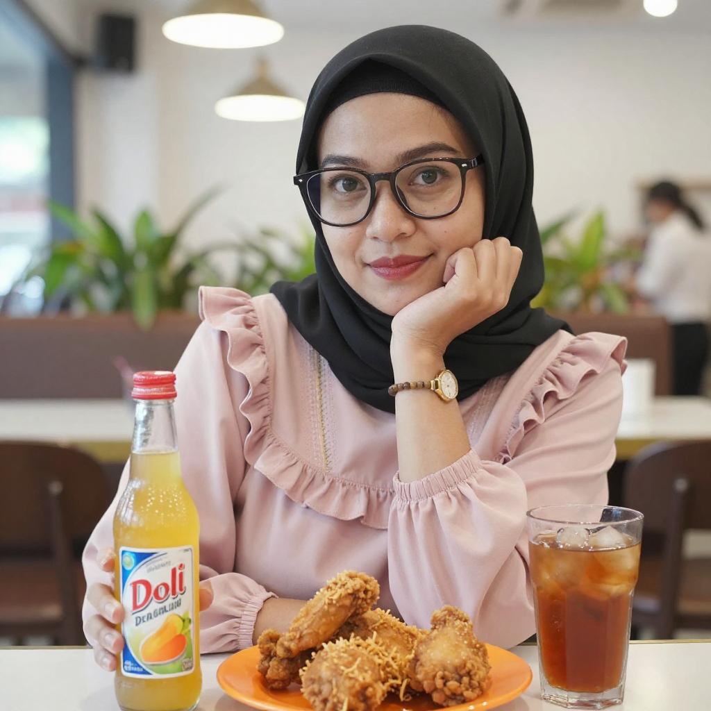 Photograph of an Asian woman with fair skin, black hijab, and glasses, wearing a pink ruffled blouse, sitting at a restaurant table. She rests her chin on her hand, with a bottle of "Doli" juice, orange plate with fried chicken, and a glass of iced tea in front of her. Background includes bright lights and indoor plants.