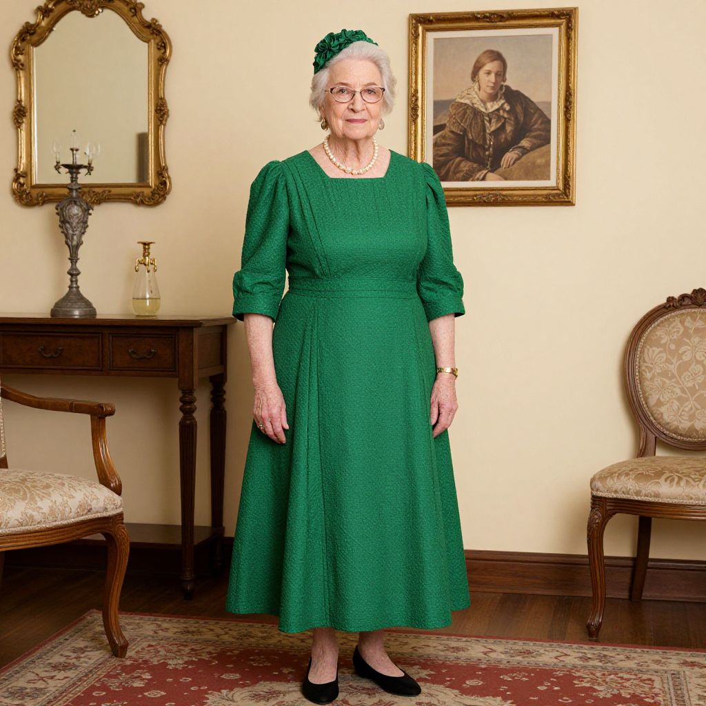 Photograph of an elderly white woman with short gray hair, wearing glasses, a green, long-sleeved, knee-length dress with a subtle texture, and a matching green hat. She stands in a traditional, warmly lit room with cream-colored walls. Behind her, a dark wooden console table holds a candlestick and a small glass bottle. A framed portrait of a stern-looking man in period clothing hangs above. Two ornate, upholstered chairs with wooden frames flank her, and a red-patterned carpet covers the wooden floor. The overall style is elegant and vintage.
