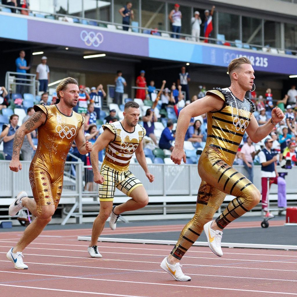 Dynamic action shot of competitors in beer Olympic costumes racing down a track, their outfits glistening with amber and gold tones, bubbly patterns, and stylish keg-inspired designs, with a modern stadium and enthusiastic fans cheering.