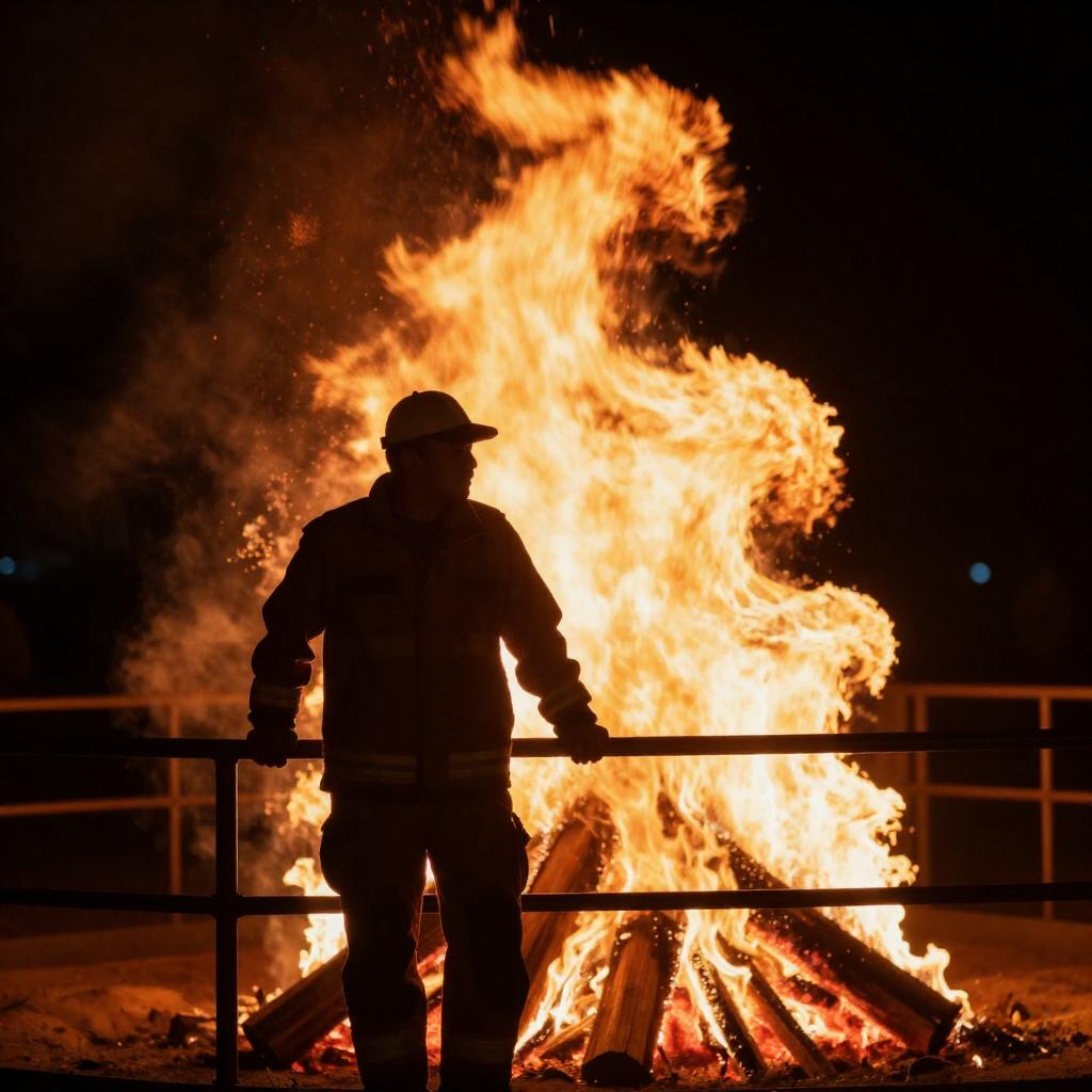 Photograph of two firefighters in dark, camouflage uniforms with reflective helmets, climbing a wooden ladder through a mesh net. The scene is dimly lit with warm, yellowish light, highlighting the rugged ures of the wooden beams and mesh. The firefighters are positioned diagonally, ascending the ladder, with one slightly ahead of the other.