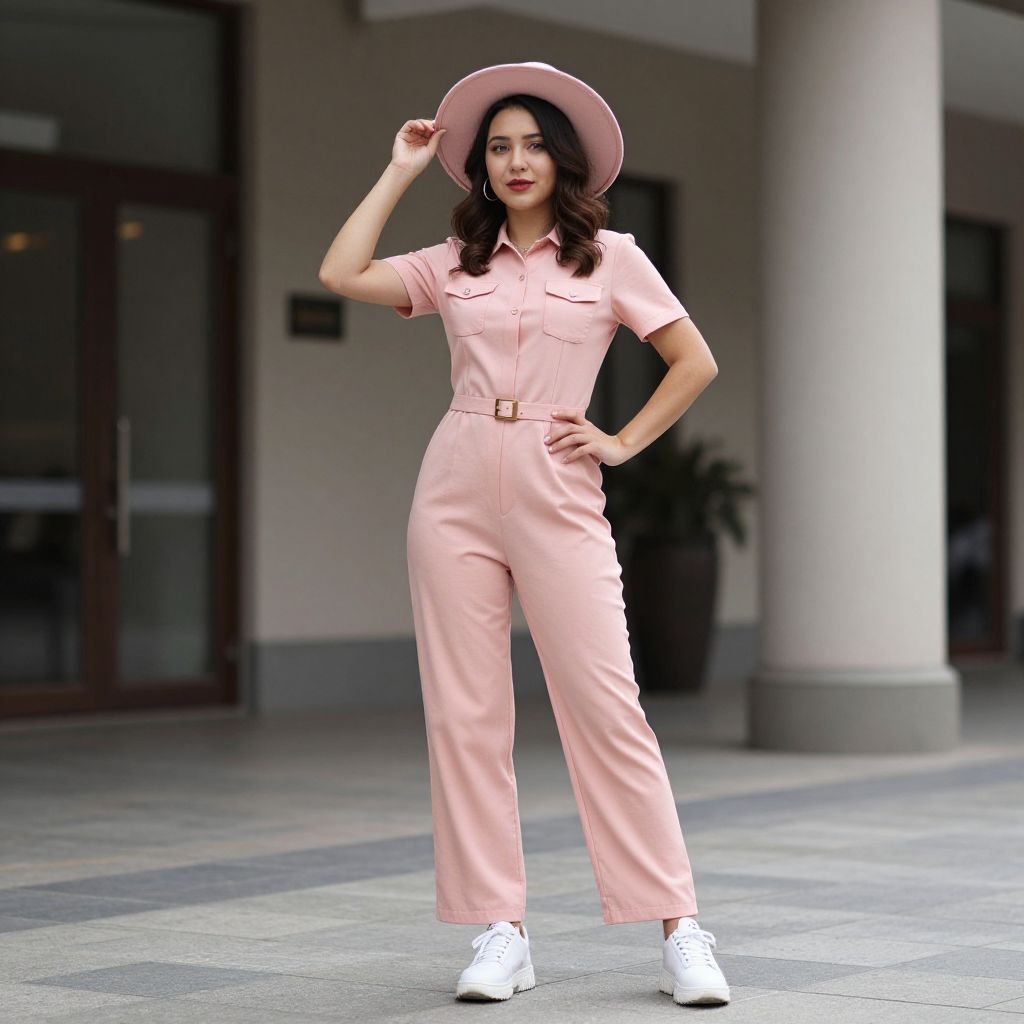 Peach Outfit Woman Costume, woman in pink jumpsuit and hat posing for a picture