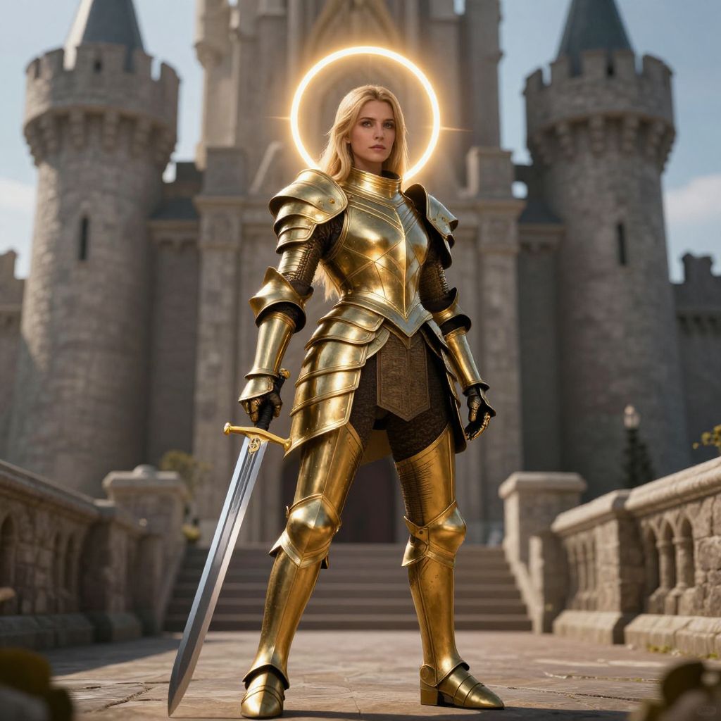 Blonde woman in golden armor with glowing halo, holding sword, stands confidently before medieval castle in CGI image.