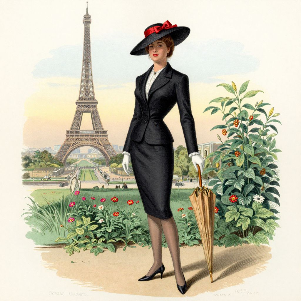 This digital illustration depicts a poised woman standing in front of a backdrop of the Eiffel Tower in Paris. She wears a black tailored suit with a white blouse, black high-heeled shoes, and a wide-brimmed black hat adorned with a red ribbon. She holds a closed, gold-colored umbrella in her right hand and wears white gloves. Her short, red hair peeks out from under her hat. The background shows a lush garden with green foliage and red flowers, leading to the iconic Eiffel Tower. The sky is a soft gradient of yellow and orange, suggesting either sunrise or sunset. The style of the illustration is reminiscent of vintage fashion art.