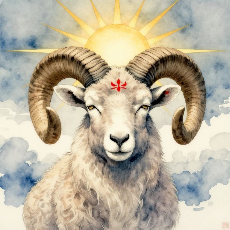 The image is a beautifully detailed watercolor Japanese poster art in the style of Toshiyuki Enoki, featuring a ram's head facing the camera. The ram, with its large, curved horns and thick, woolly fur, is depicted in a serene and majestic manner. Its eyes are closed, giving it a calm and contemplative expression. The ram's forehead is adorned with a red symbol, adding a touch of mysticism to the artwork. Above the ram, the sun is depicted with radiant rays, casting a warm, golden light that contrasts with the cool tones of the ram's fur. The background is a soft, muted palette of blues and grays, with wispy clouds adding depth and a sense of tranquility. The overall composition is balanced, with the ram centrally positioned and the sun above it, creating a harmonious visual relationship. The artwork is signed with a red stamp in the bottom right corner, adding a personal touch to the piece.