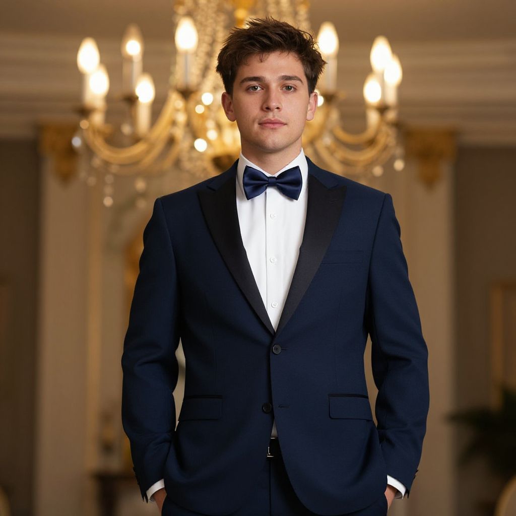 Photograph of a young Caucasian man with short, dark brown, slightly tousled hair and fair skin. He has a clean-shaven face and is wearing a dark navy blue tuxedo with a black bow tie and white dress shirt. He stands with his hands in his pockets, looking directly at the camera with a neutral expression. The background features a luxurious, ornately decorated room with a glowing, gold chandelier and soft, warm lighting. The room has cream-colored walls with gold accents and elegant, classical architectural details. The overall atmosphere is formal and sophisticated.
