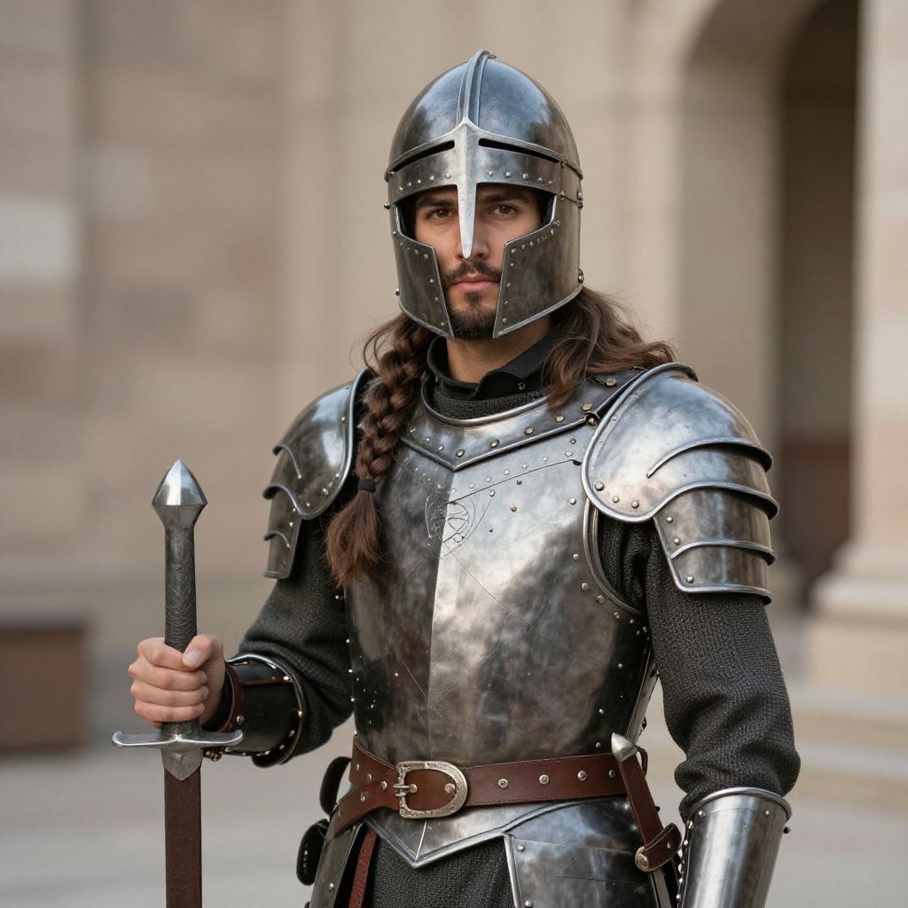 Photorealistic image of a bearded man with long brown hair, wearing medieval silver armor, helmet, and holding a sword, standing in a stone