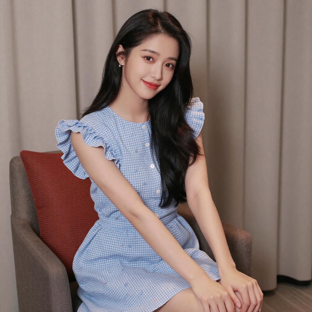 Photograph of a young Asian woman with long black hair, fair skin, and red lipstick, sitting on a brown chair. She wears a light blue gingham dress with ruffled sleeves and small floral patterns. She smiles gently, resting her hands on her knees. The background includes a red cushion and beige curtains.