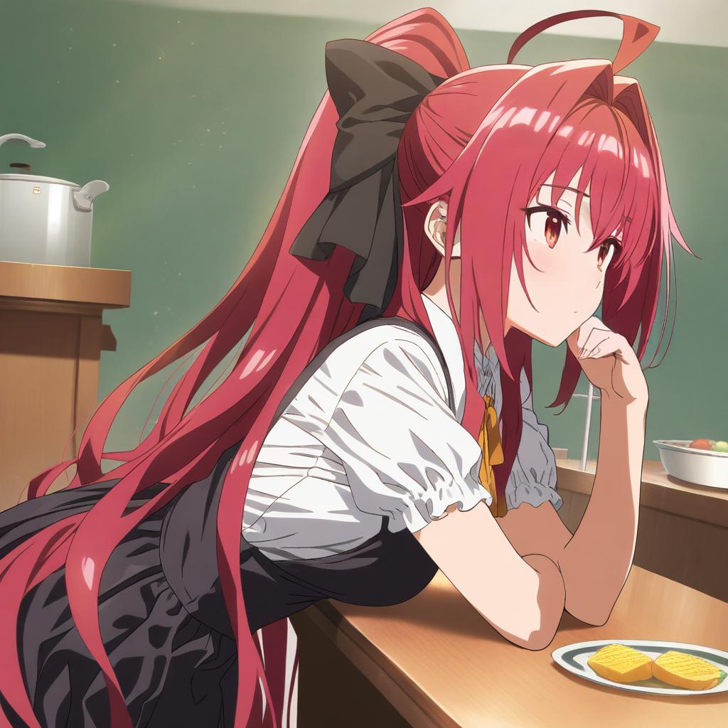 Anime style illustration of a young girl with very long red hair tied in a ponytail with a large black bow, featuring red eyes and a thoughtful expression. She is leaning on a wooden table in a room with muted green walls. The girl wears a white blouse with puffed short sleeves and a black dress. On the table in front of her are two yellow rectangular food items on a plate and a bowl of fruit in the background.