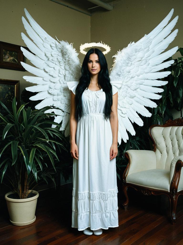 Woman high low angel costume, halo, solo, wings, 1girl, angel, black hair, looking at viewer, standing, indoors, plant, long hair, angel wings, full body, fine art parody, realistic, chair