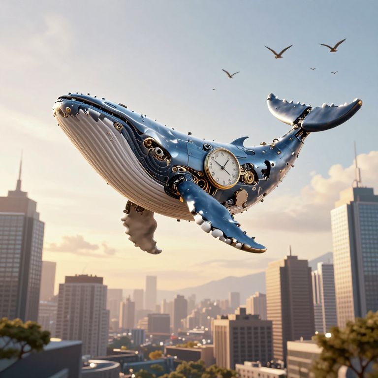 A surreal 3D-rendered scene depicts a mechanical whale adorned with a large clock face, gracefully floating above a bustling cityscape, where skyscrapers stand tall against a backdrop of golden-hour sunlight and a flock of birds soaring in the sky.
