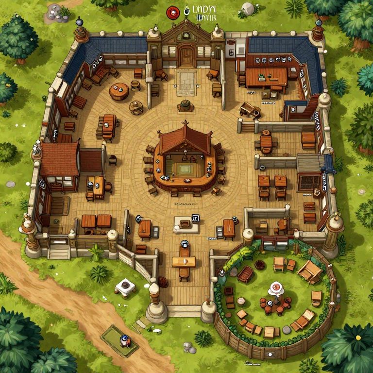 Dnd inn map, vibrant and richly textured illustration of a medieval inn’s floor plan with labeled rooms, tavern tables, a bustling bar, hidden cellar, and outdoor garden seating, includes character tokens and inventory markers, stylized fantasy cartography