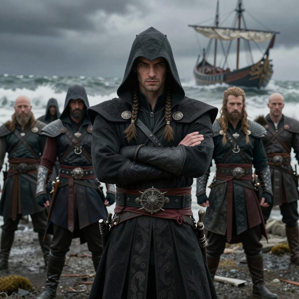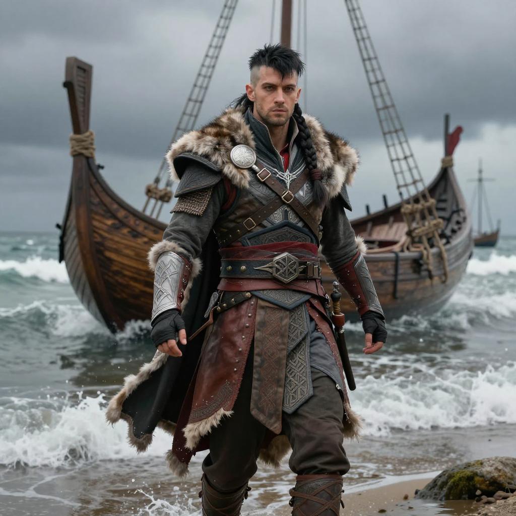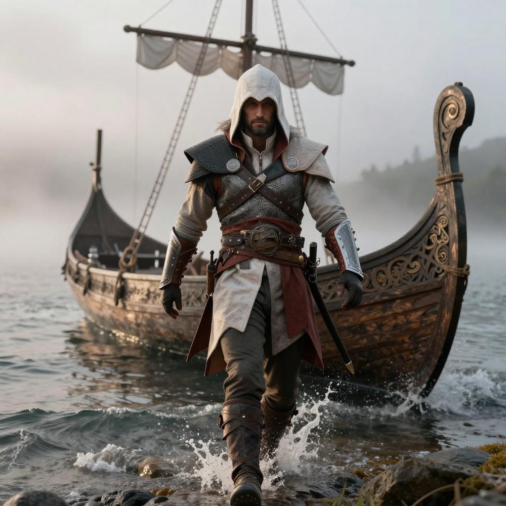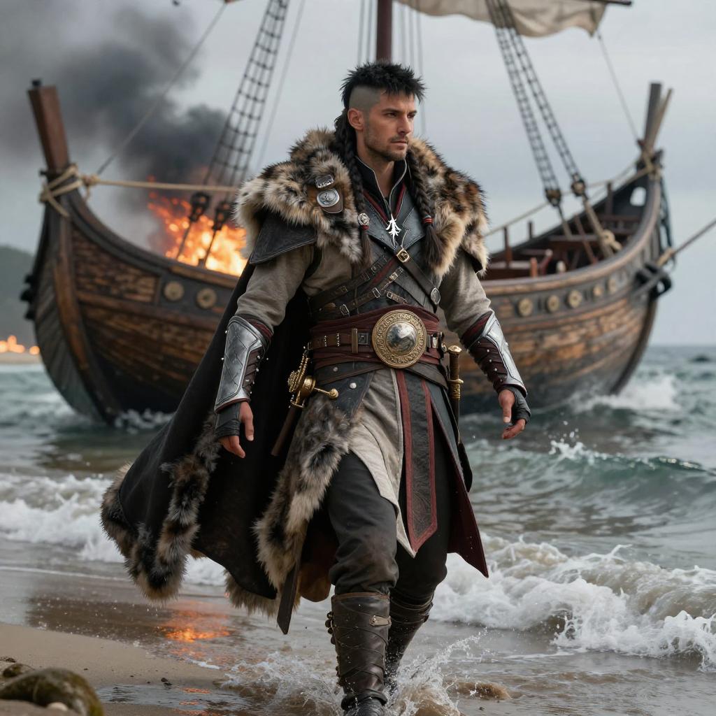 Assassin's creed cosplay, Viking shieldmaiden with long red hair and tight braids, layered leather and fur armor with intricate Norse knotwork, walking forward through shallow surf, longship looming behind them, cinematic scene in nighttime harbor lit by torches and pale moonlight, dramatic lighting, detailed costume, realistic photography, ultra-detailed, high resolution