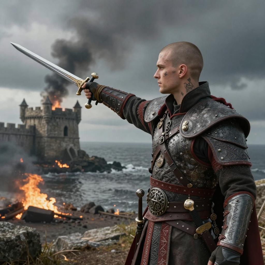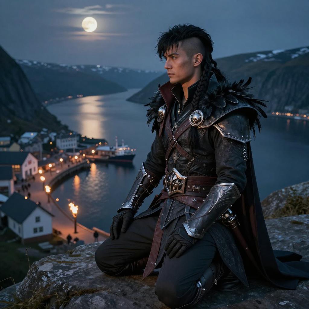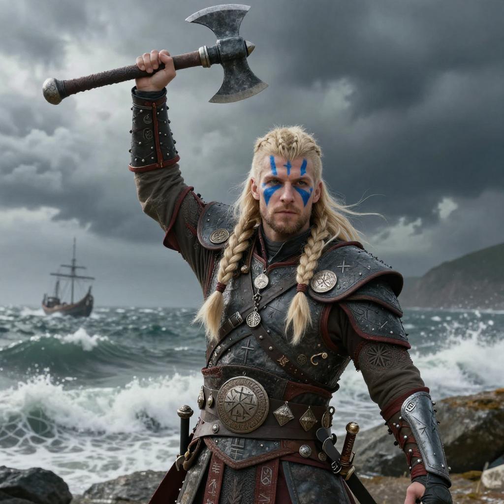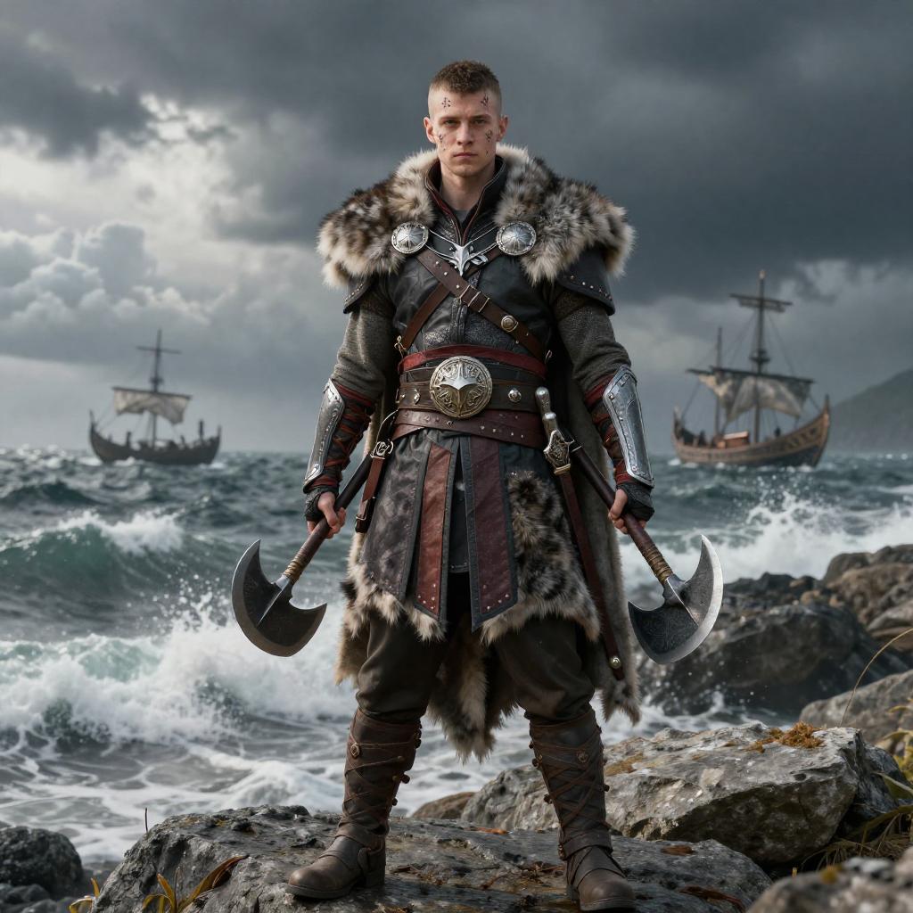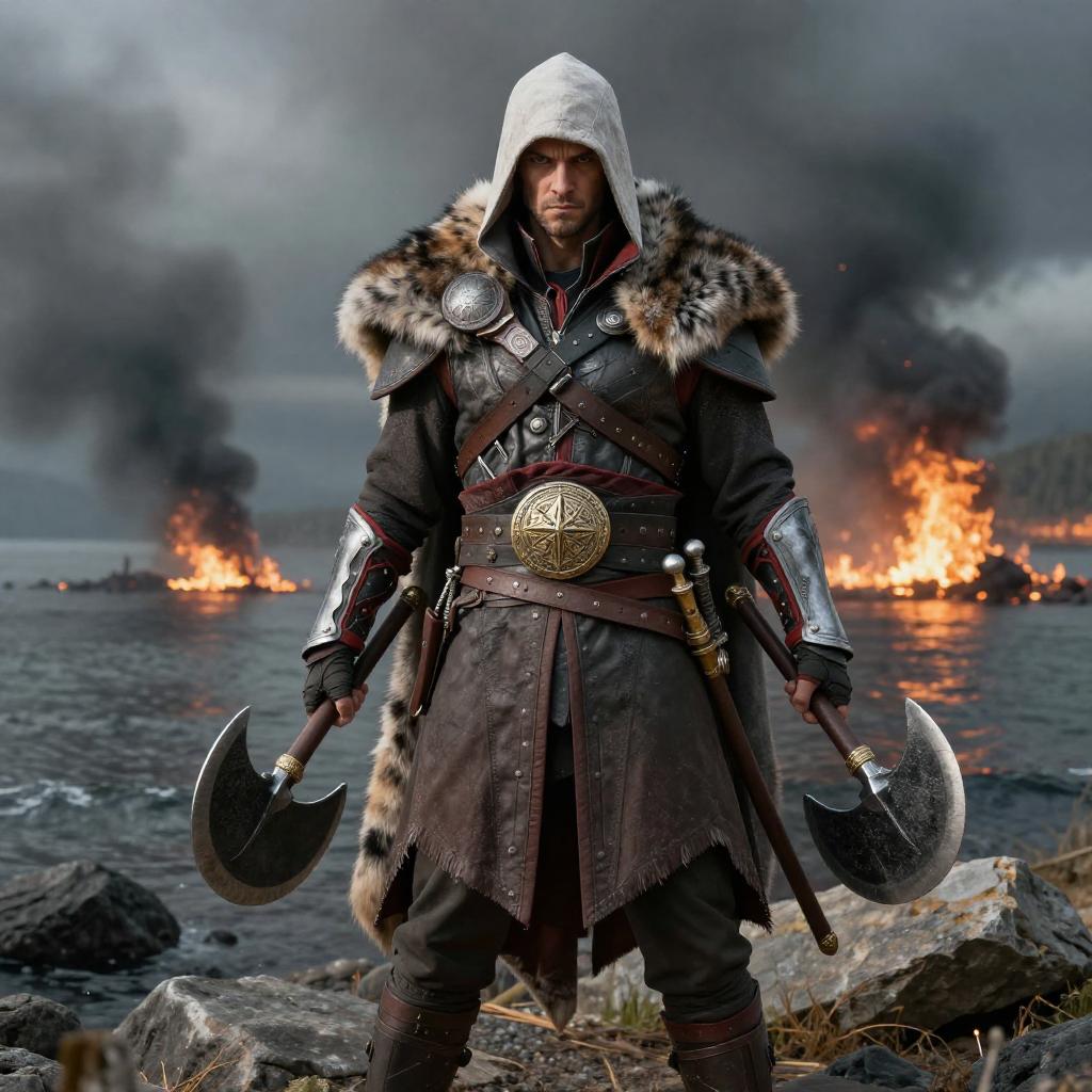 Assassin's creed cosplay, Viking shieldmaiden with long red hair and tight braids, layered leather and fur armor with intricate Norse knotwork, walking forward through shallow surf, longship looming behind them, cinematic scene in nighttime harbor lit by torches and pale moonlight, dramatic lighting, detailed costume, realistic photography, ultra-detailed, high resolution