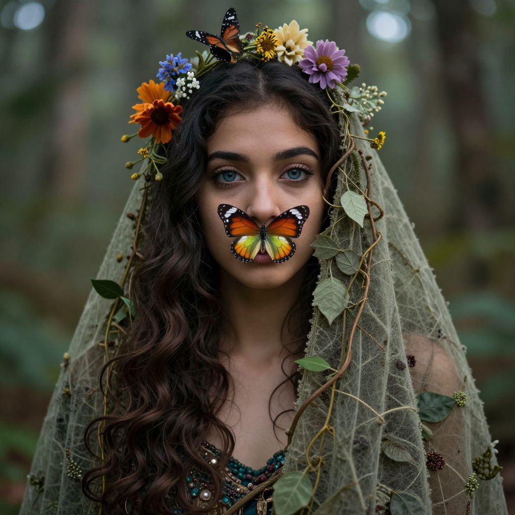 A young Middle Eastern woman with mesmerizing blue eyes and dark, wavy hair stands in a serene pose amidst a jungle clearing at dawn. Partially concealed by a veil of delicate leaves and vines, her tranquil expression is faintly visible. The surrounding forest blurs into focus, seamlessly blending with the flora adorning her features. A butterfly alights on her nose, its vibrant wings mirroring the exotic flowers woven into her hair. This portrait captures an enchanting moment where nature and human grace harmoniously intertwine, evoking a sense of tranquility and wonder as if the woman's gaze holds some mystical depth.