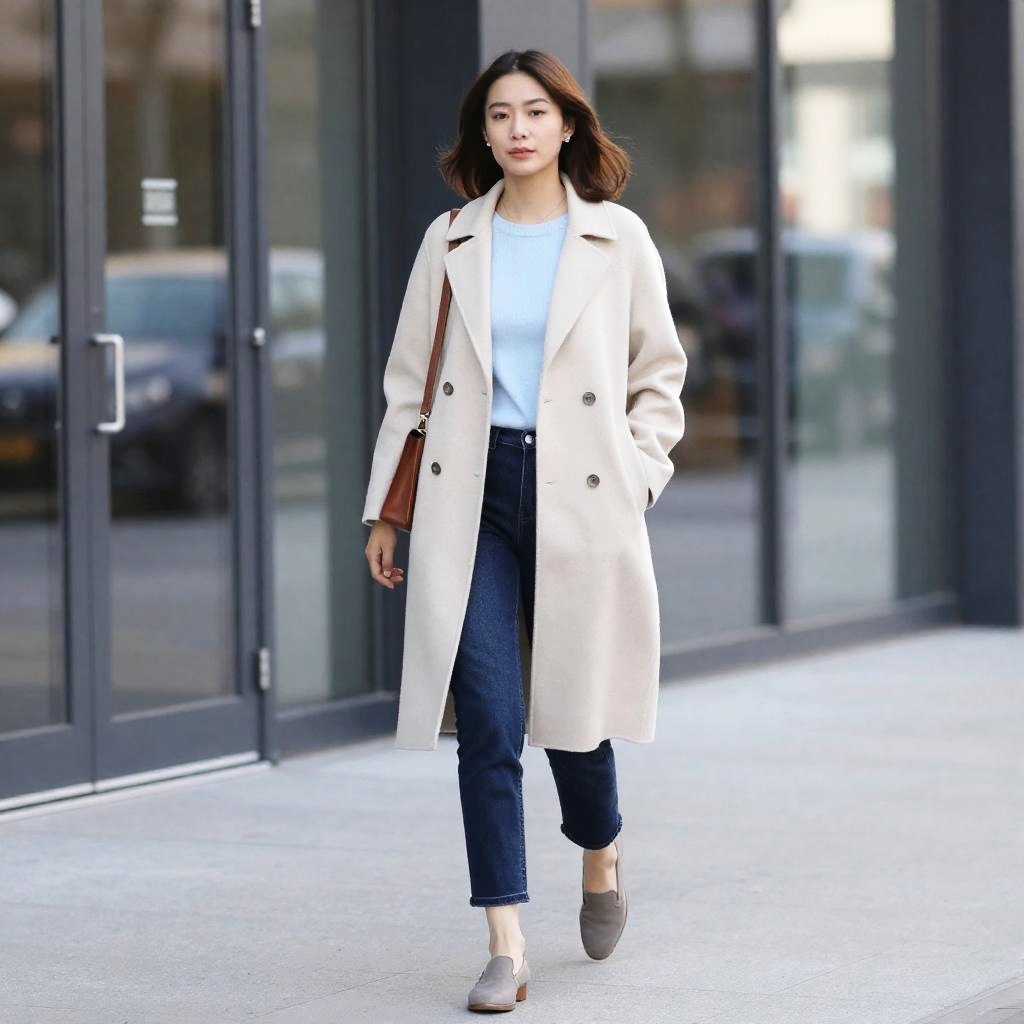 Red-haired woman walking on a concrete sidewalk, wearing a long beige coat, blue jeans, and white sneakers. Brown handbag over shoulder. Glass and brick building with double doors in background. Casual, relaxed pose. Midday light.