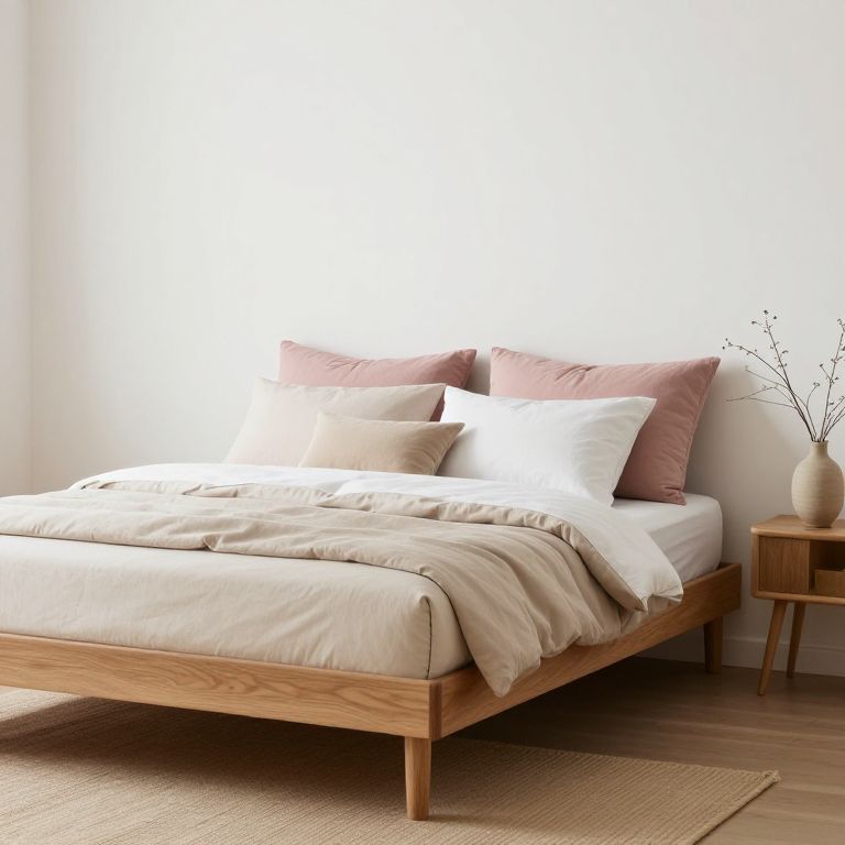 Cozy bedroom setup featuring a low wooden bed with a beige mattress, layered with soft pillows in shades of pink, white, and beige, complemented by a matching beige duvet; positioned against a plain white wall, the bed is flanked by a small wooden side table holding a vase with dried branches and a woven rug beneath, creating a serene and minimalist aesthetic.