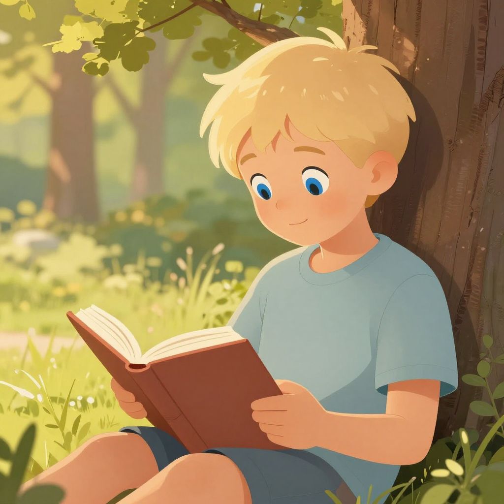 Illustration of a 10-year-old boy with blonde hair and blue eyes reading a book under a tree, peaceful and serene, warm colors, soft shadows, storybook style