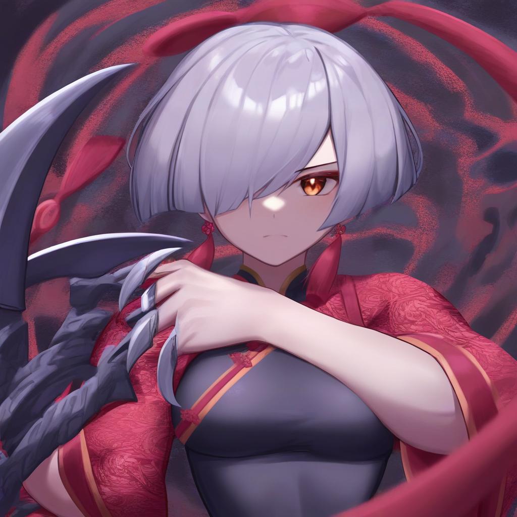 Digital illustration of a female anime character with pale skin, short white-grey hair covering one eye, and striking red eyes. She wears a traditional Chinese-style dress with red and gold accents, tassel earrings, and holds a claw weapon and claw ring. The character has a serious expression with a mole under her mouth, set against a dark red and black abstract background.