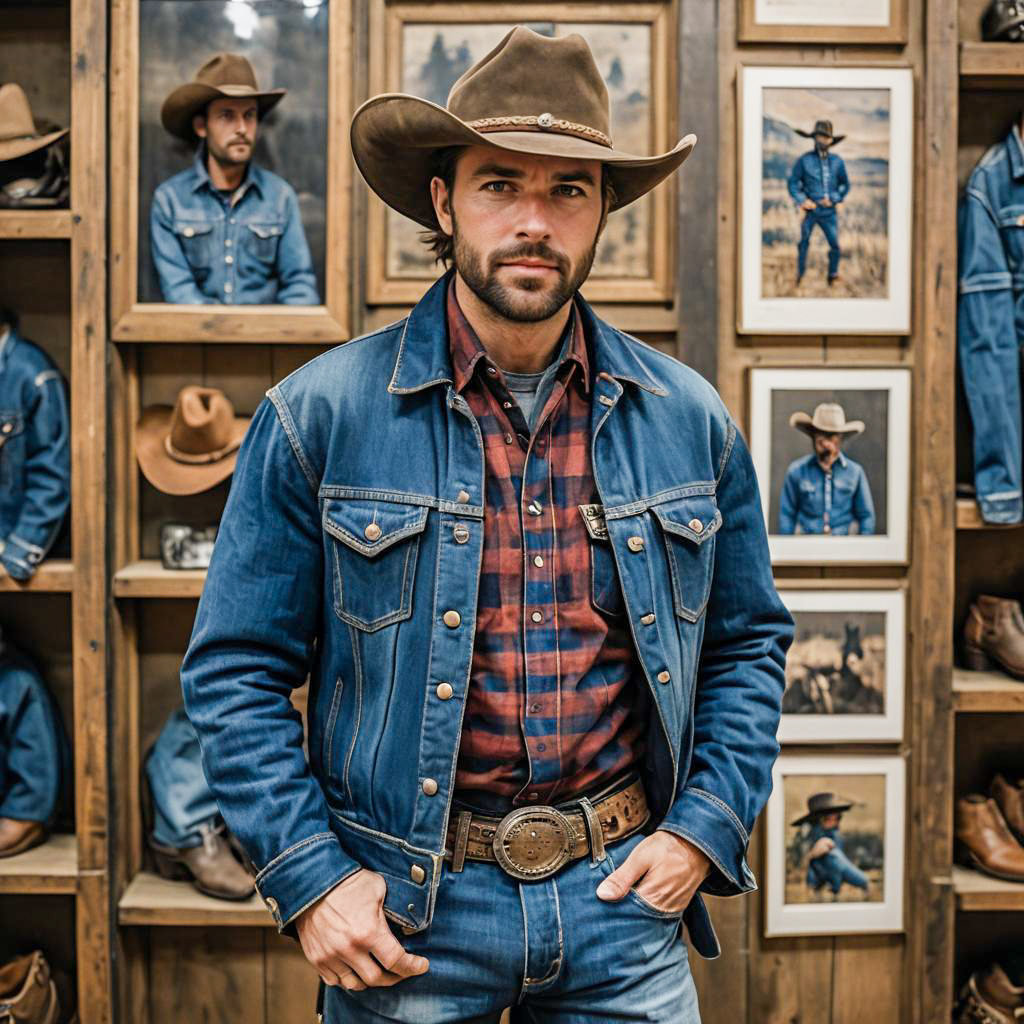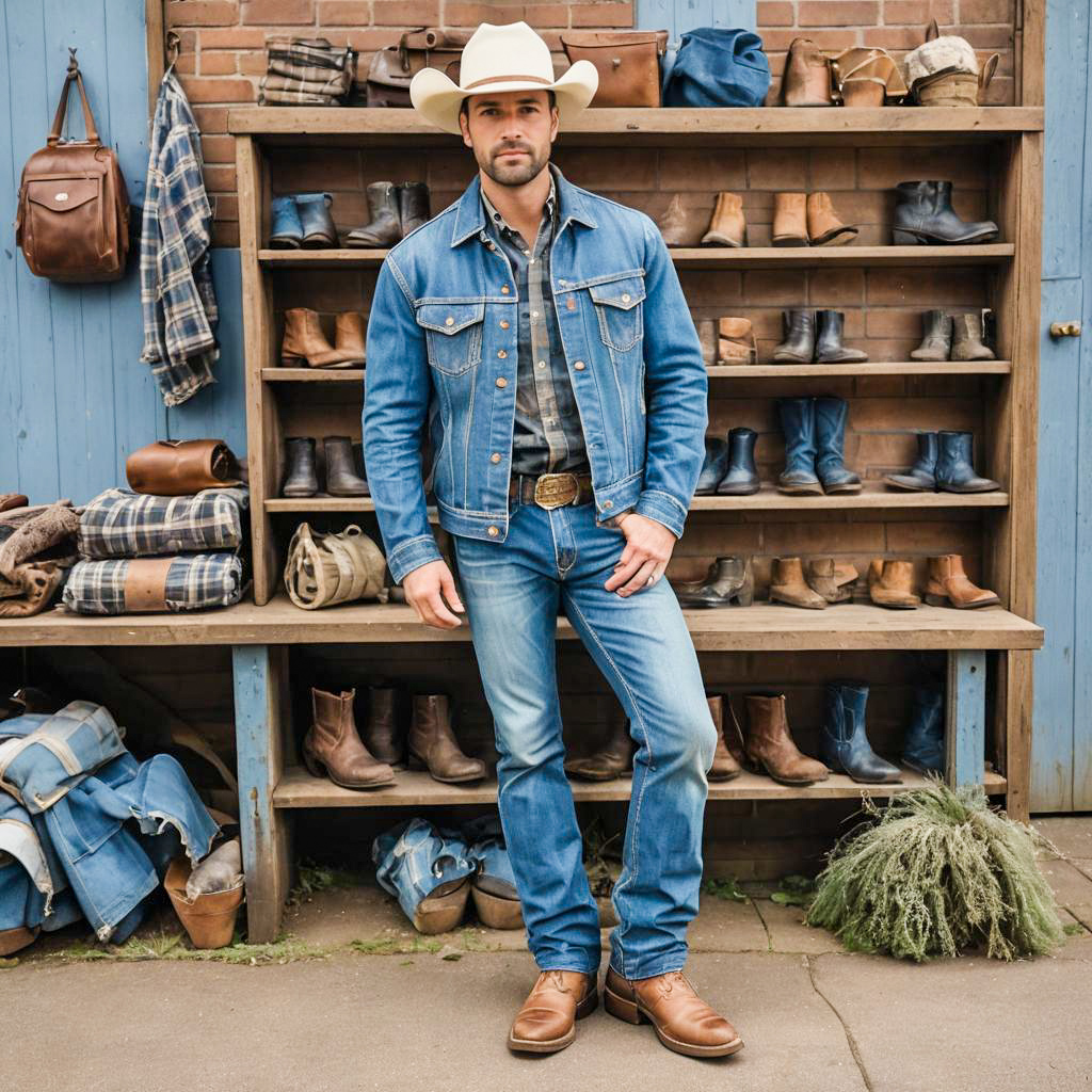 Photo of a Rugged Build man, High Fade, country outfit, denim jacket with bootcut jeans and cowboy boots, light blue denim, white and brown tartan, muted colors