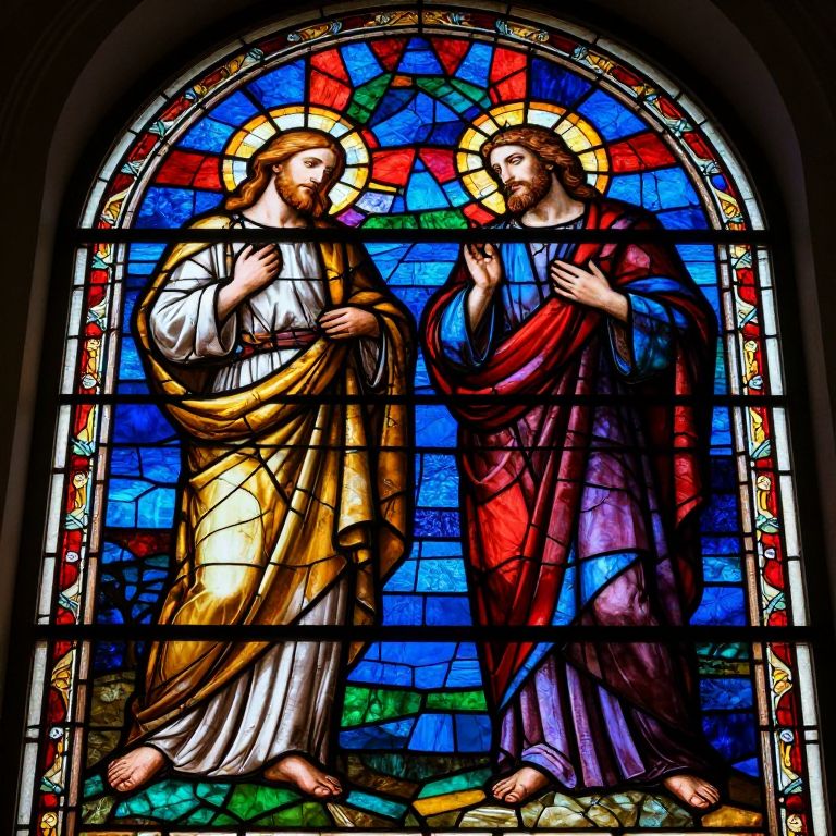 Stained glass window depicting two haloed, robed Jesus figures in gold and red, standing against a vibrant blue and red background.
