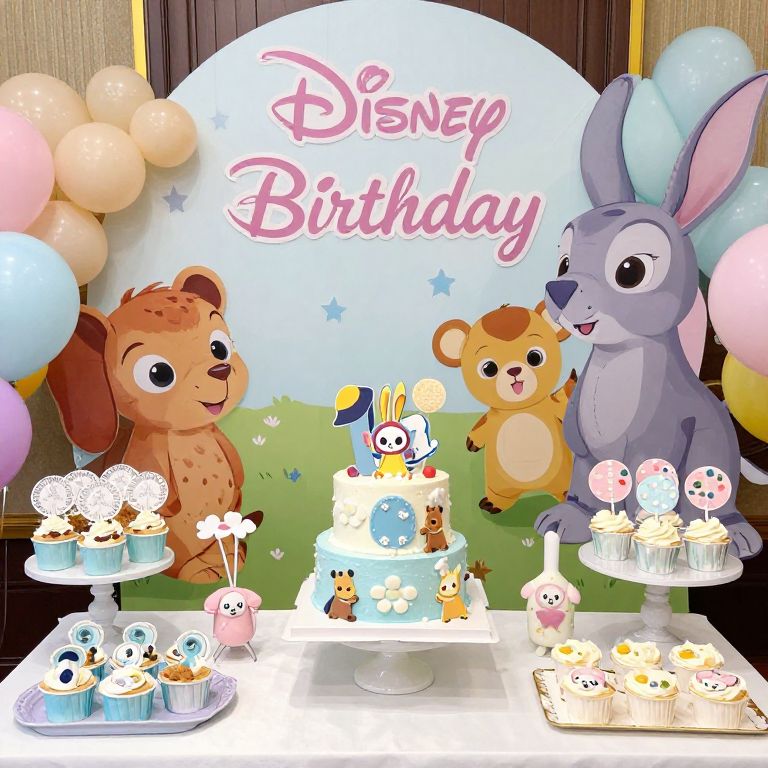 This digital illustration depicts a Disney-themed birthday party setup. In the center, a large banner reads "Disney Birthday" in pink cursive text. Two animated characters, a brown bear and a gray bunny, stand on the right and left, respectively, next to a table adorned with cupcakes and a decorated cake featuring a yellow and blue candle. The background includes a wooden wall and colorful balloons in pastel shades. The table displays multiple cupcakes with white frosting and small topper characters, including a blue penguin. The overall style is bright and whimsical, with a focus on cheerful colors and playful characters.