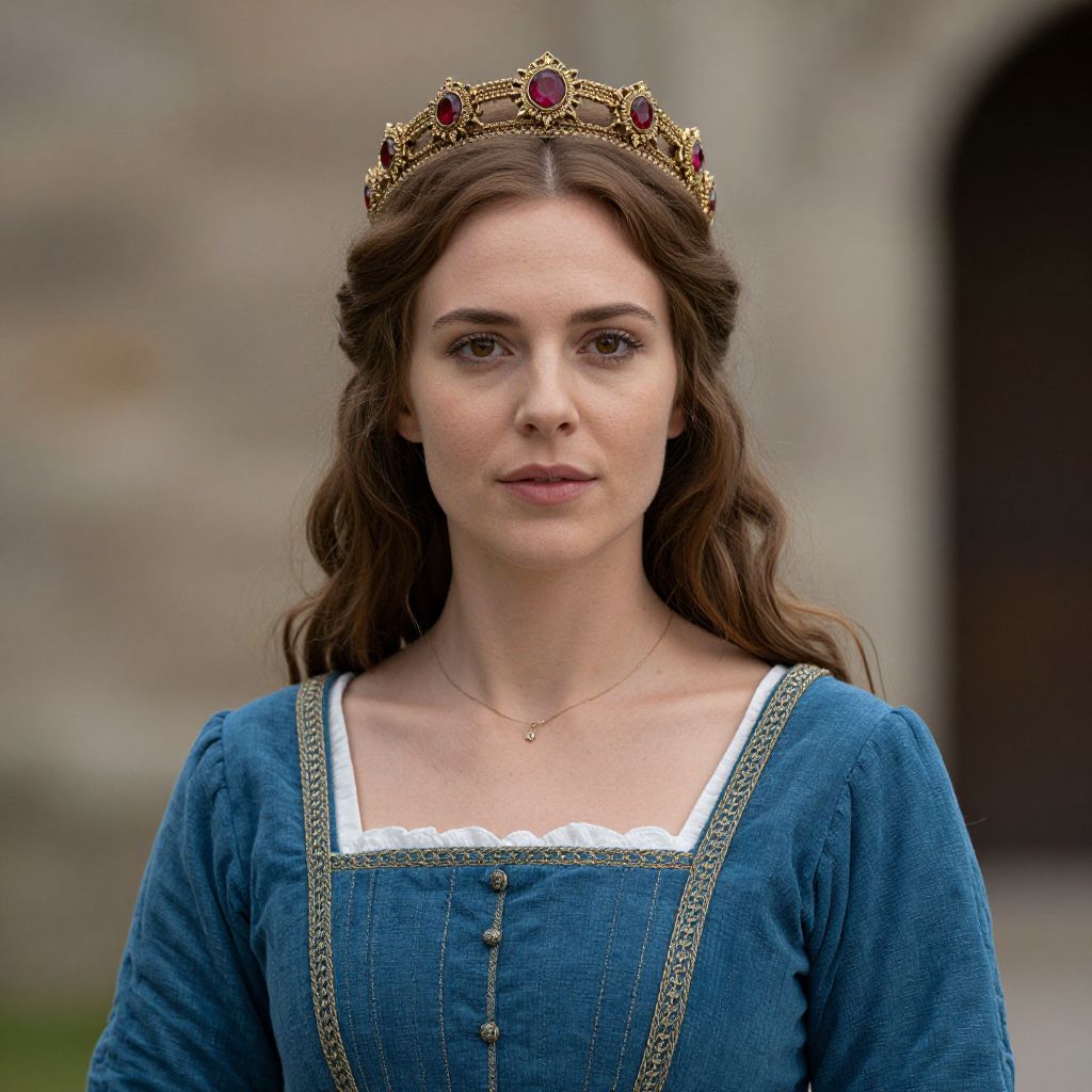Medieval outfit female, a close up of a woman in a blue dress with a crown on her head