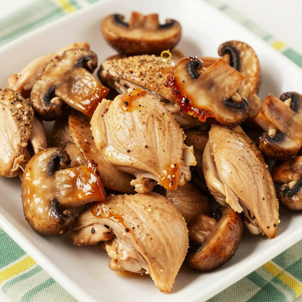 A close-up photo of a white rectangular plate filled with juicy, cooked chicken chunks and caramelized mushroom slices. The chicken is light beige with black pepper specks, while the mushrooms are brown with a crispy edge. The plate sits on a green and yellow striped cloth. The image has a high-contrast, slightly over-saturated style, emphasizing the textures and colors of the food.