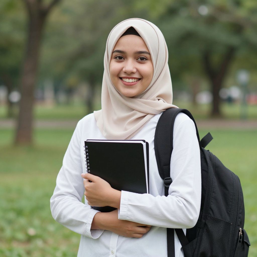 Young Muslimah woman smiling brightly while standing outdoors in a lush green park, holding a stack of black notebooks in her hands and carrying a black backpack over her shoulder.