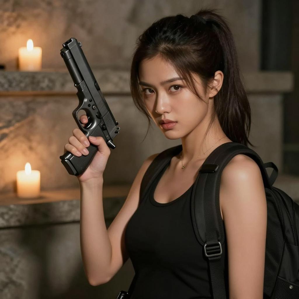 Female with pale skin and dark hair wearing a black bra and holding a rifle. She has a star tattoo on her upper left arm. Red lipstick, dark eye makeup. Dimly lit brick wall background. She looks to the side with a neutral expression. Rifle strap across her chest. Dark, moody lighting.