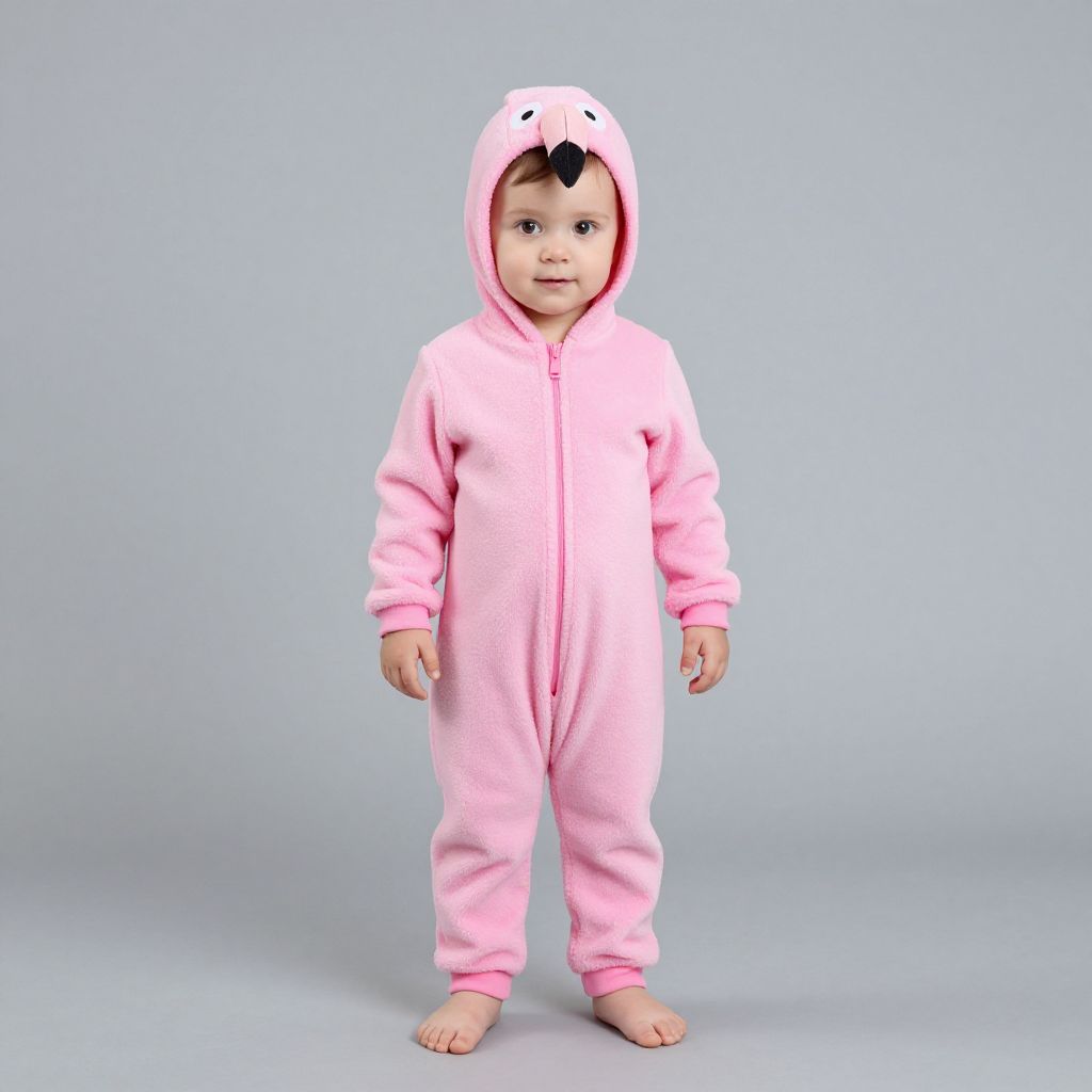 Pink flamingo infant costume, solo, full body, barefoot, male focus, 1boy, standing, looking at viewer, hood, onesie, grey background, pajamas