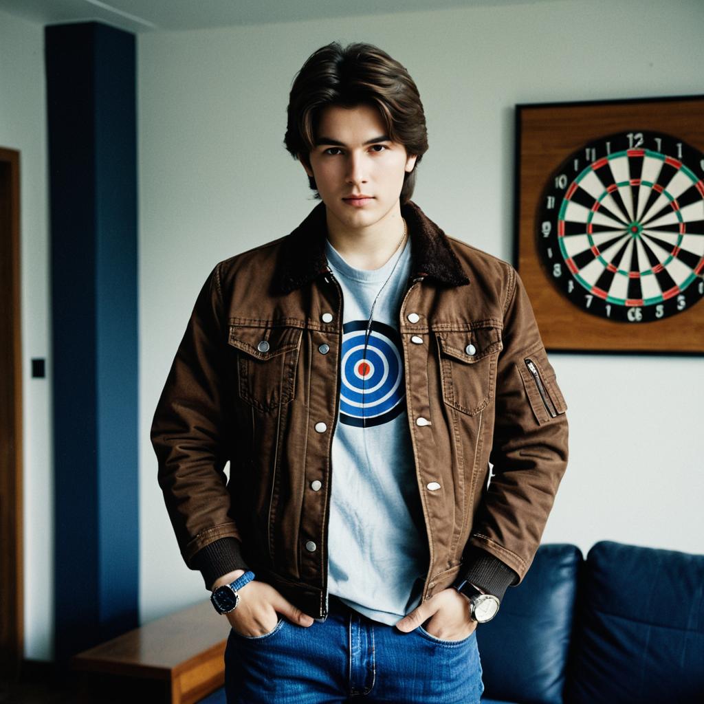 A young man with brown hair stands indoors wearing a brown jacket with a shearling collar over a white t-shirt featuring a target design. He is dressed in blue denim jeans and accessorized with two wristwatches. In the background, a dartboard is visible on the white wall, and a dark blue couch adds to the casual interior setting.