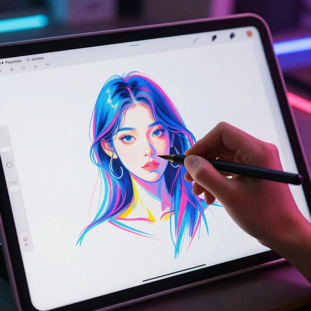 Free AI drawing tools visualized as an interactive virtual canvas with AI brush assistance, colorful digital strokes appearing in real-time, cyberpunk style with vibrant blues and pinks, blending human creativity with artificial intelligence