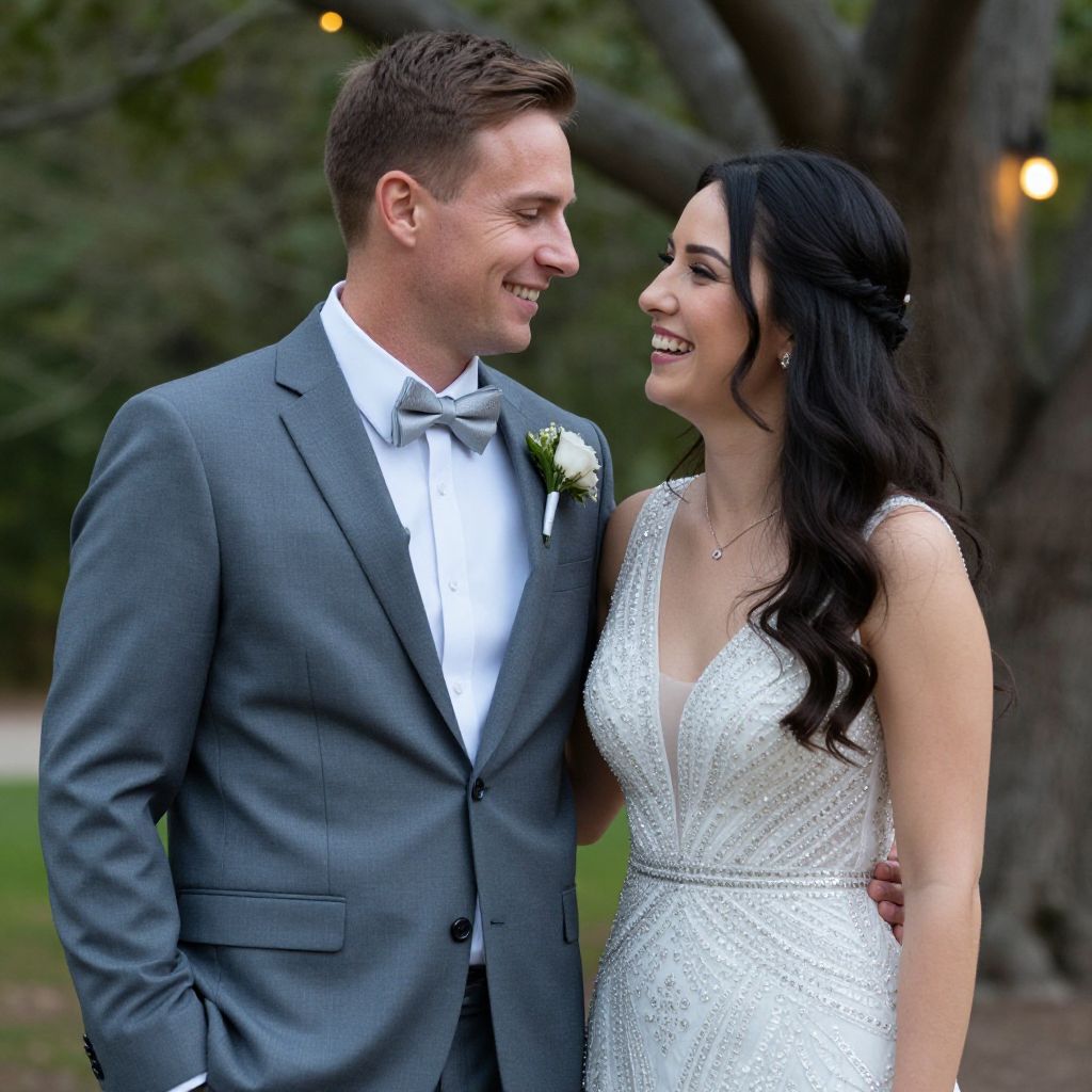 Two individuals, dressed in formal attire—a man in a gray suit with a bow tie and boutonniere, and a woman in a sparkling white dress—share a warm, joyful moment outdoors, surrounded by trees and soft lighting.