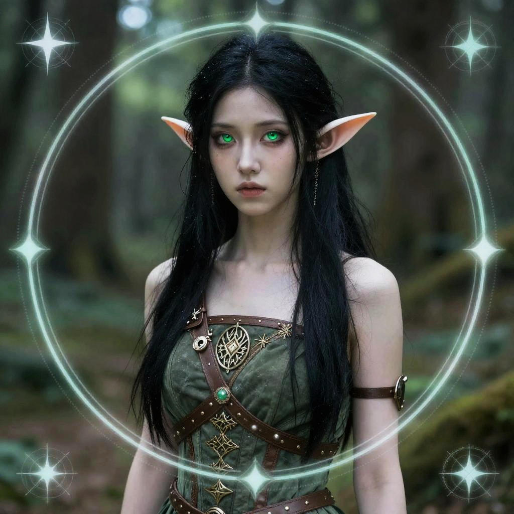 Slender spectral illusionist, with messy silver hair entwined with glowing runes, elongated pointed ears, piercing emerald green eyes, pale gray skin, surrounded by flickering spectral flames, wearing fragmented crystal veil garment, detailed and atmospheric