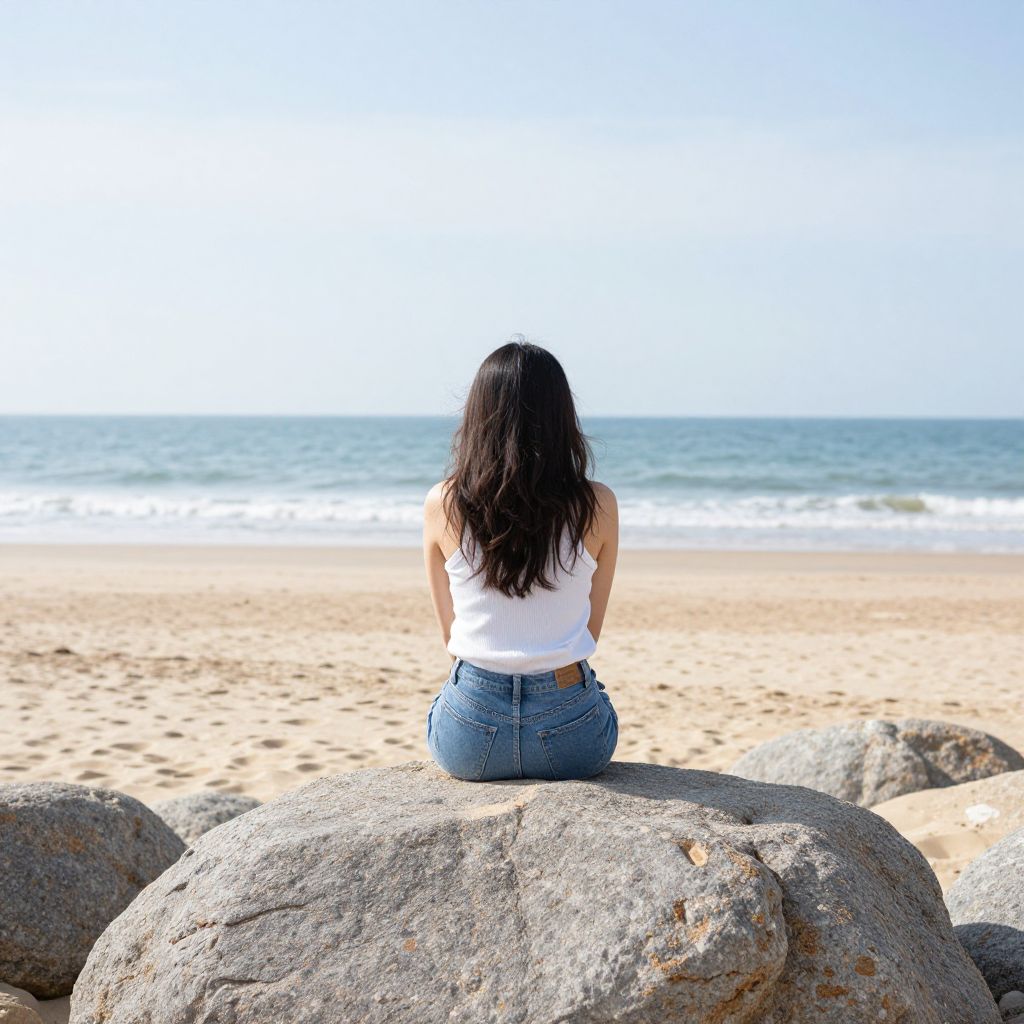 Photograph of a woman with long, dark hair, wearing a white sleeveless top and high-waisted blue jeans, sitting with her back to the camera on a large, gray rock at a beach. The sandy shore stretches out in front of her, meeting the blue ocean with gentle waves. The sky is clear and blue, casting bright sunlight on the scene. The rocks around her are scattered and textured. The overall mood is calm and reflective, capturing a serene moment by the sea.