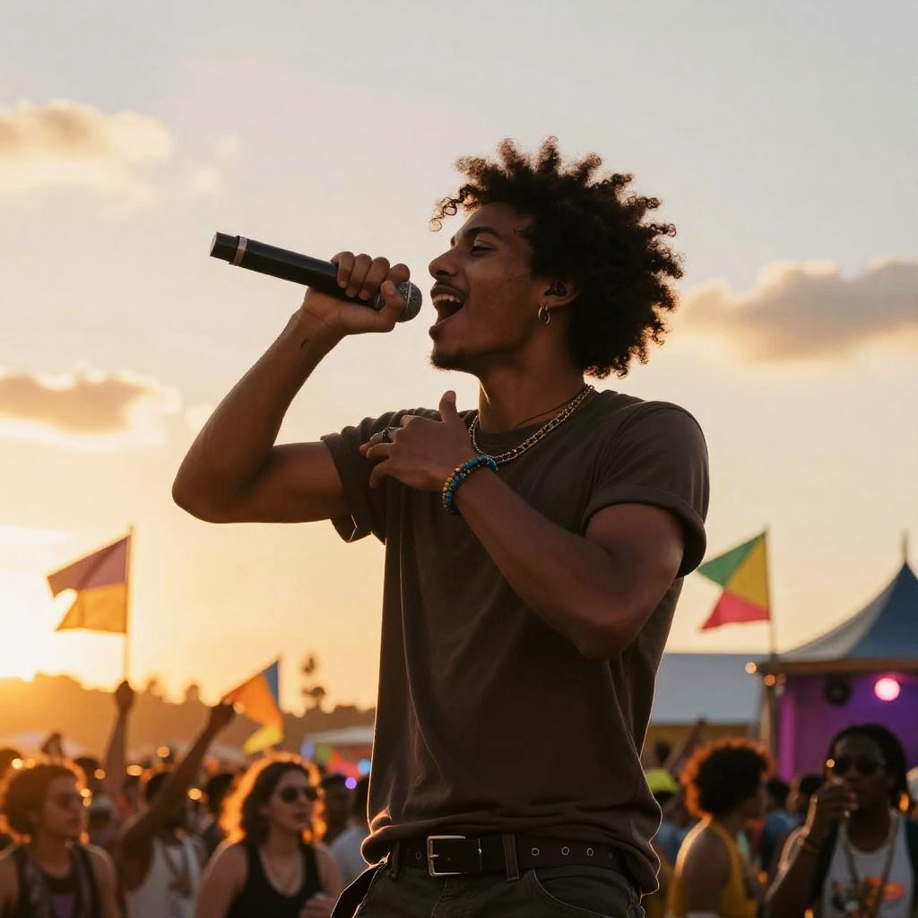 Energetic male singer with afro hair performing outdoors at sunset, vibrant festival crowd, colorful flags waving, vivid sky with warm golden hues, expressive singing gesture